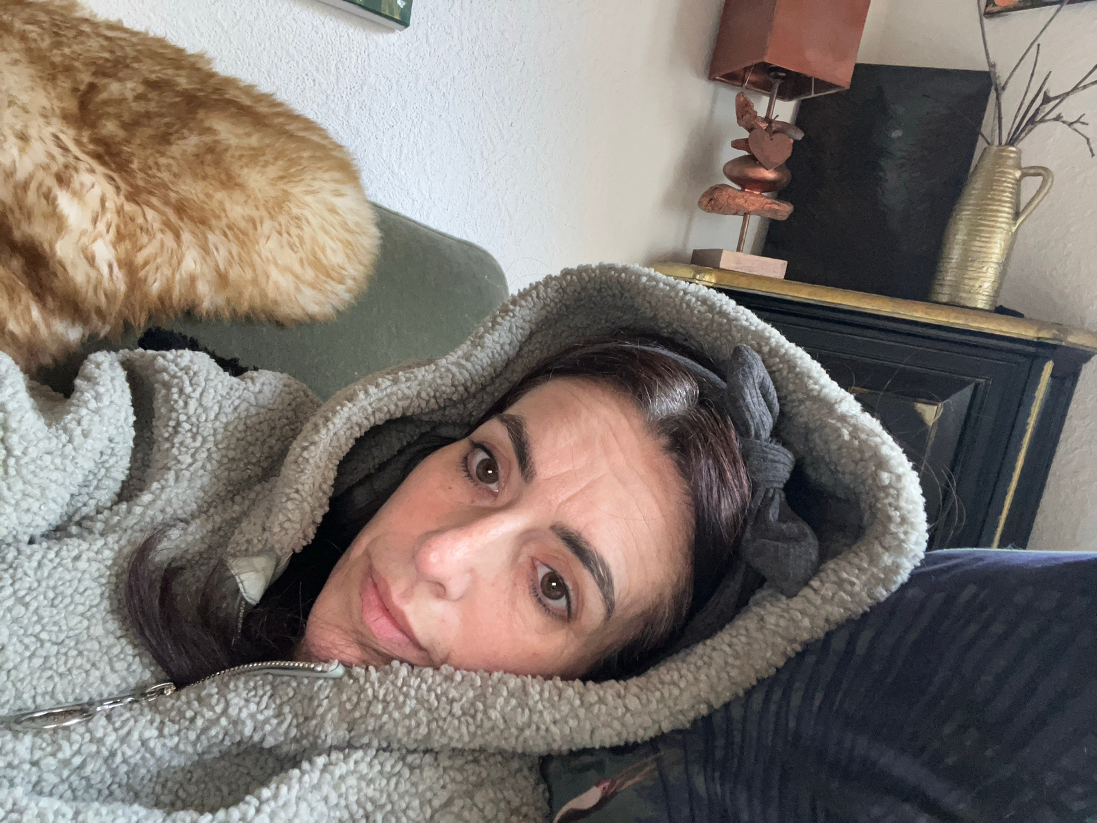 A woman with brown hair is wearing a grey, sherpa-lined hoodie. She is looking directly at the camera. The hood of the sweatshirt is pulled up around her head. The camera is close to her face. To the…read more