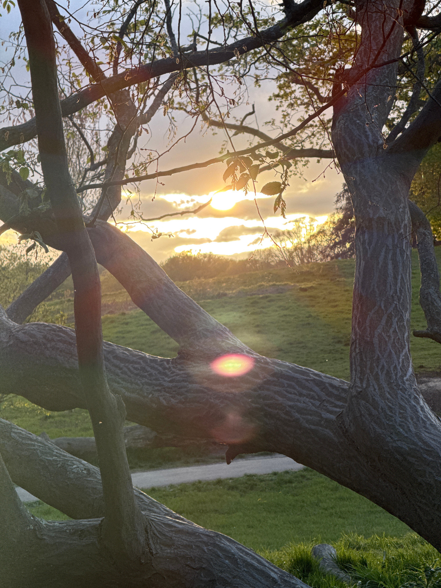 The image shows a view through tree branches towards a sunset. In the background, there is a grassy area and a path. The scene is likely in a park, and based on the landscape features, and tree types,…read more