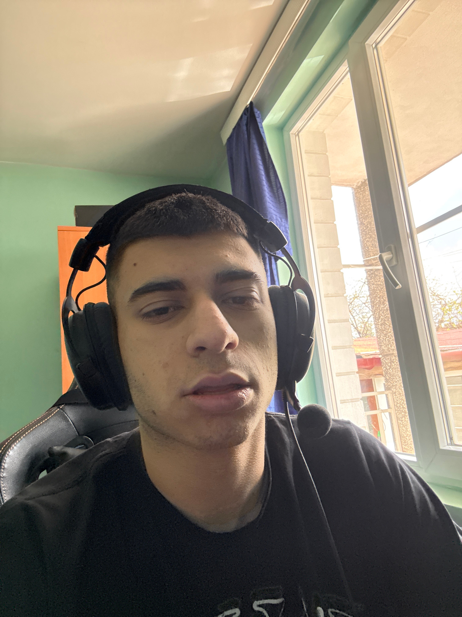A close-up, rotated headshot of a person wearing black headphones with a microphone. The person is positioned indoors, with a window in the background. The window reveals an exterior scene, potentiall…read more