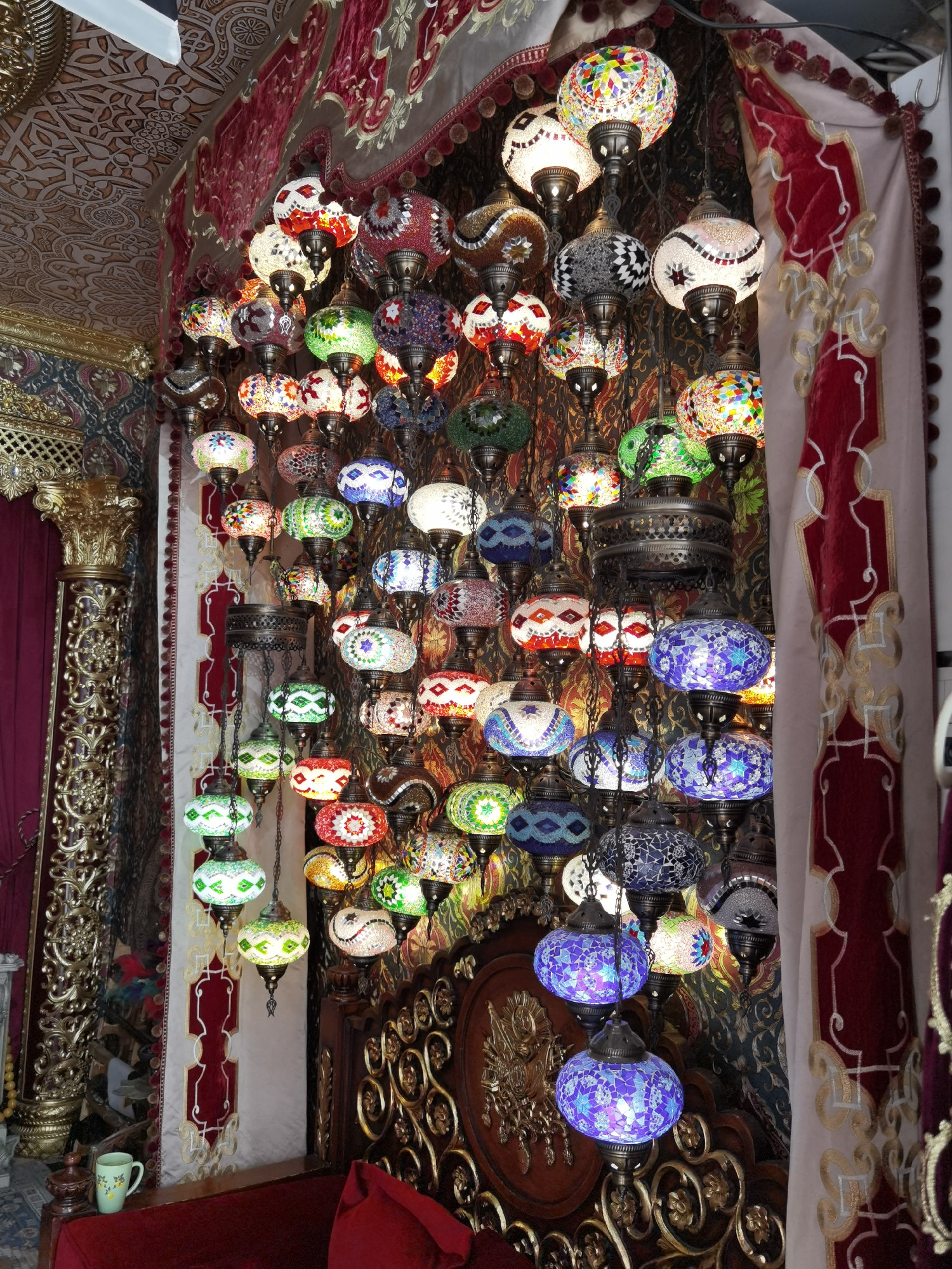 The image shows a dense display of Turkish mosaic lamps hanging from the ceiling. These lamps are of various sizes and colors, with intricate geometric and floral patterns composed of small pieces of…read more