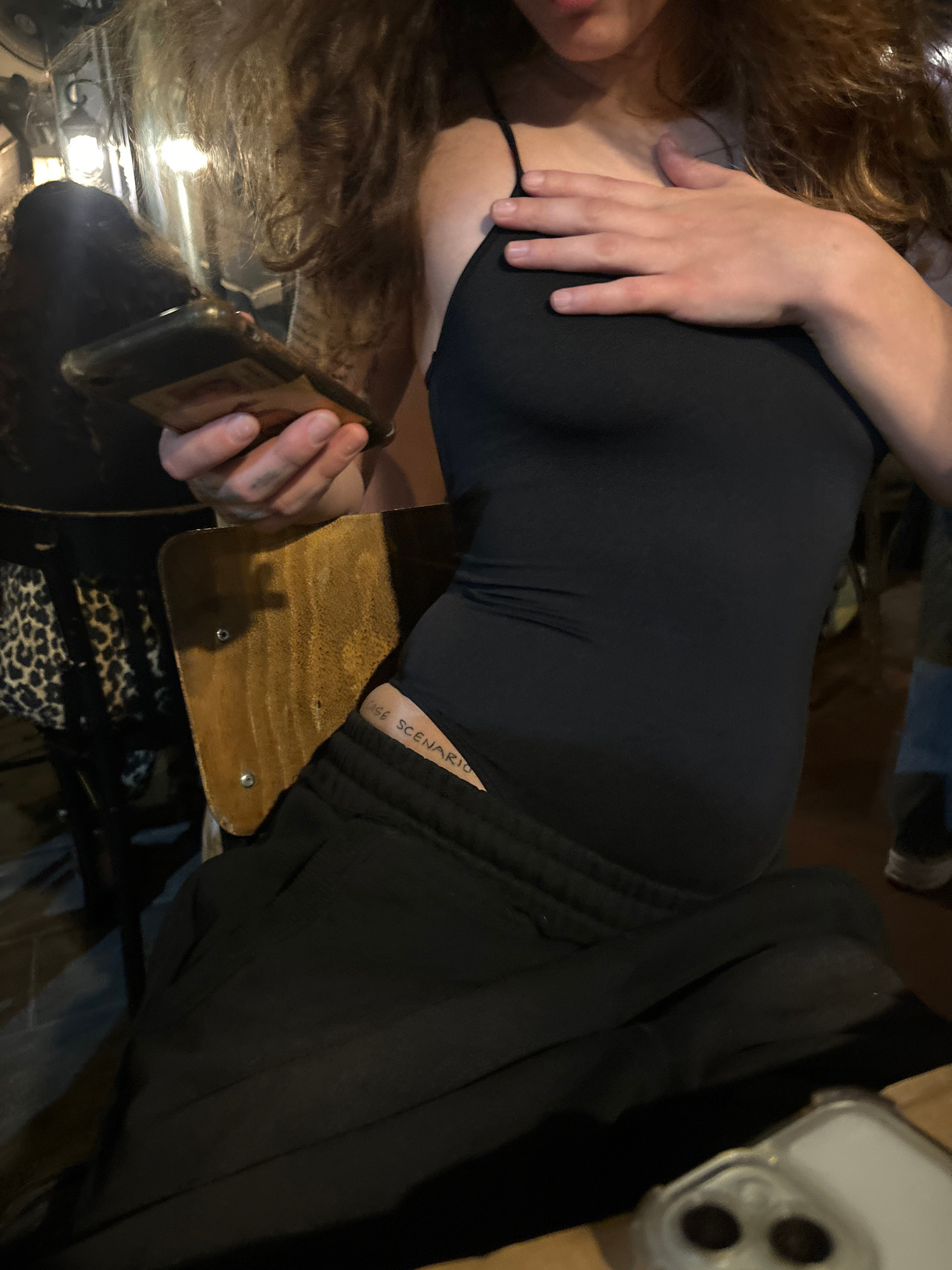 A partially visible person, likely female, is shown in an indoor setting, viewed from an oblique angle. The subject has long, wavy, reddish-brown hair that cascades over their shoulder. They are dress…read more