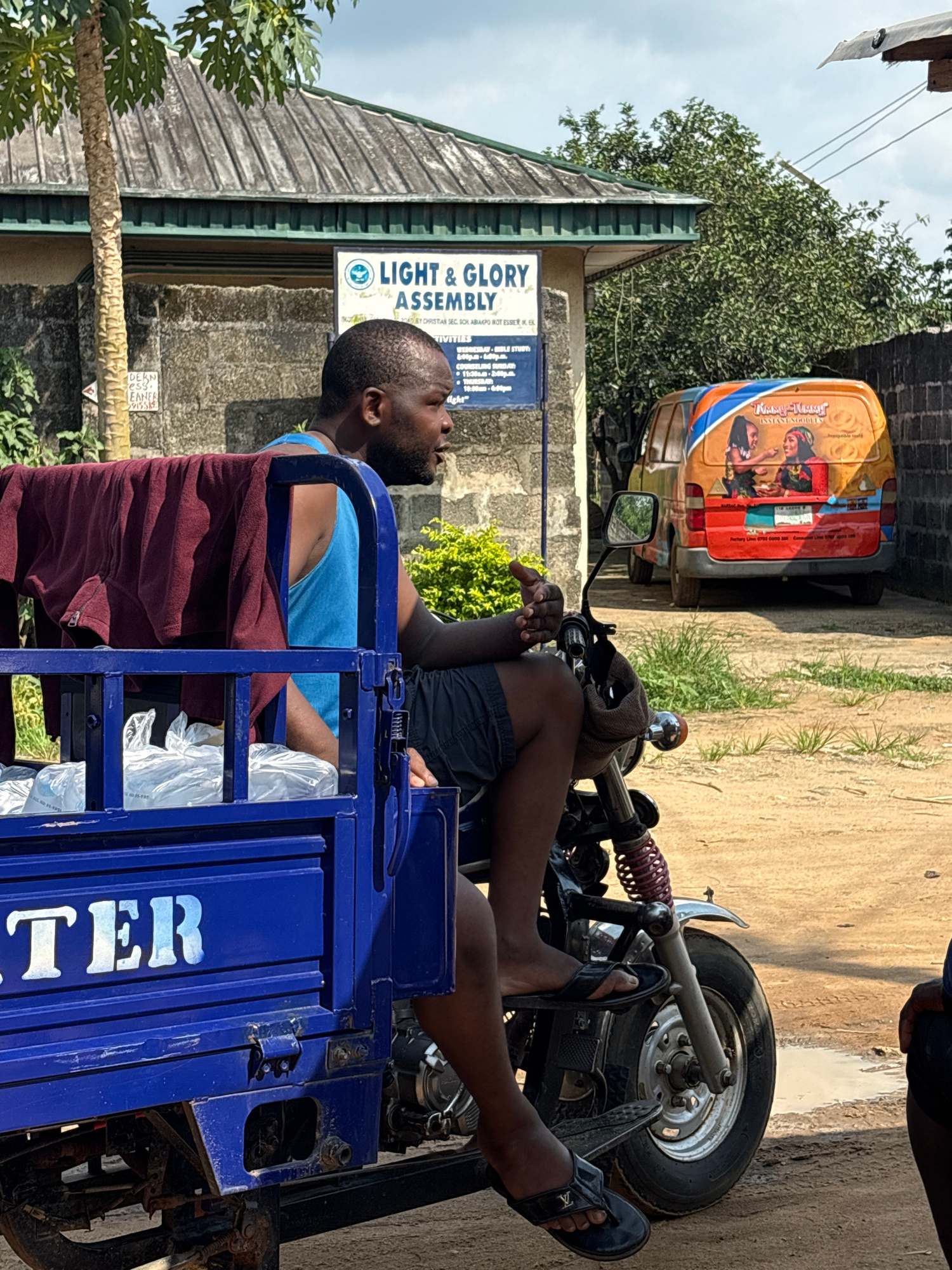 A man is on a blue three-wheeled vehicle in Ikot Ekpene, Nigeria. The vehicle has “TER” printed on its side. The man wears a blue tank top and gray shorts, and he is sitting in the vehicle. In the bac…read more