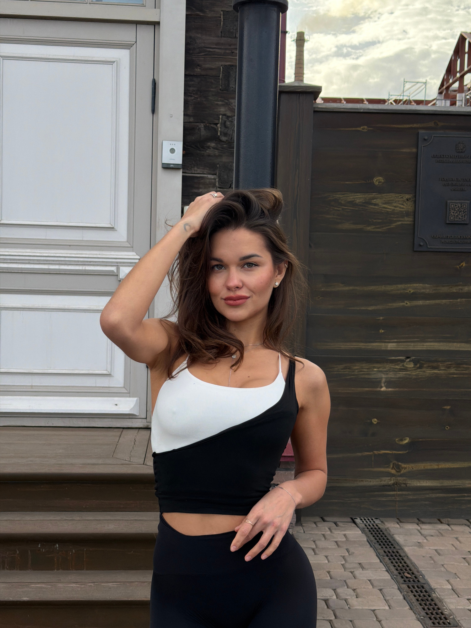 A woman in a black and white top and black leggings stands outdoors. She is in front of a building with dark wooden walls and a white door. A plaque with text and a QR code is visible on the wall. The…read more