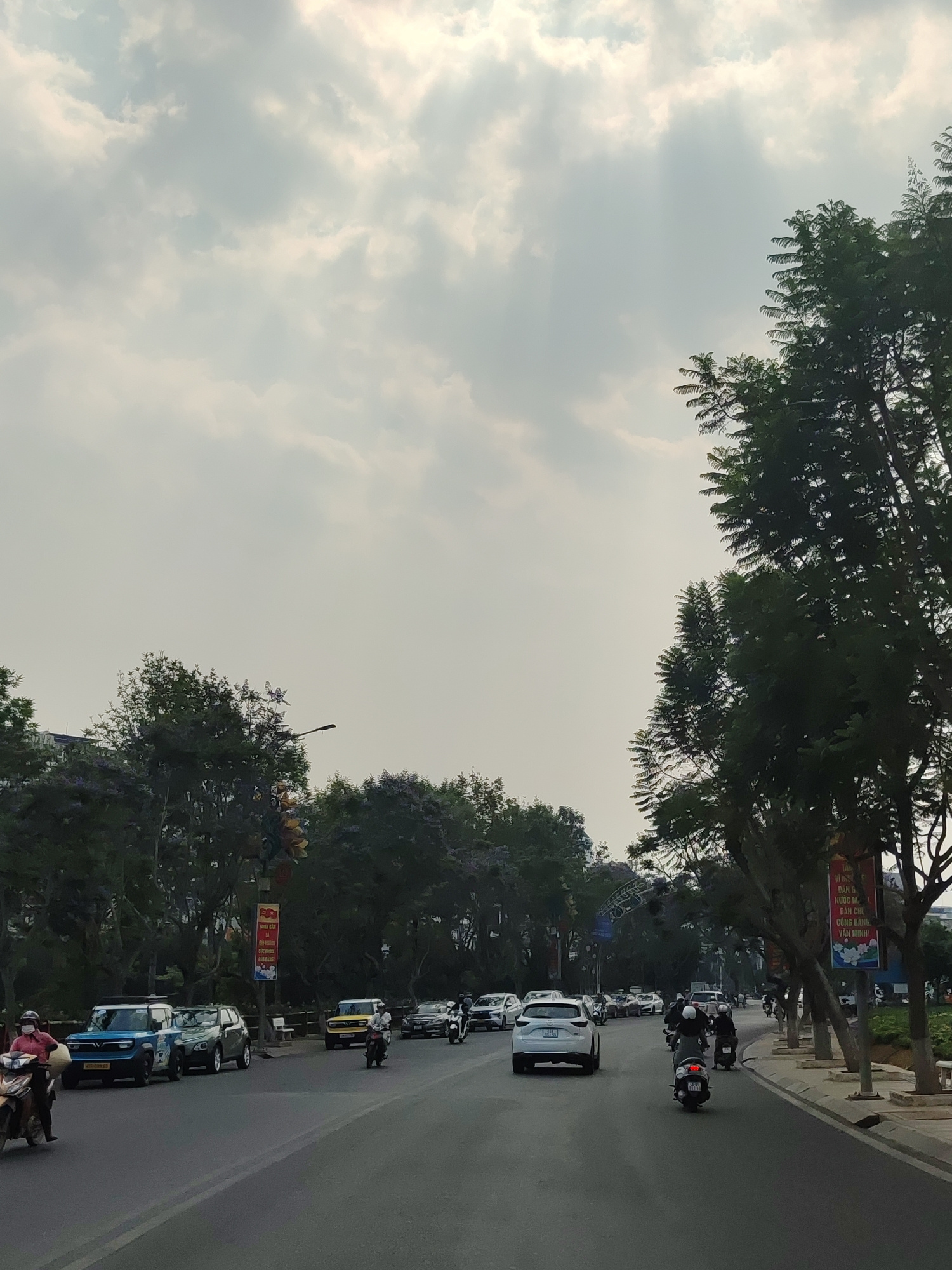 The image depicts a street scene in Da Lat, Vietnam. The sky is overcast with visible sun rays breaking through. The street is asphalt and gray, with traffic including cars and motorbikes. Vehicles ar…read more