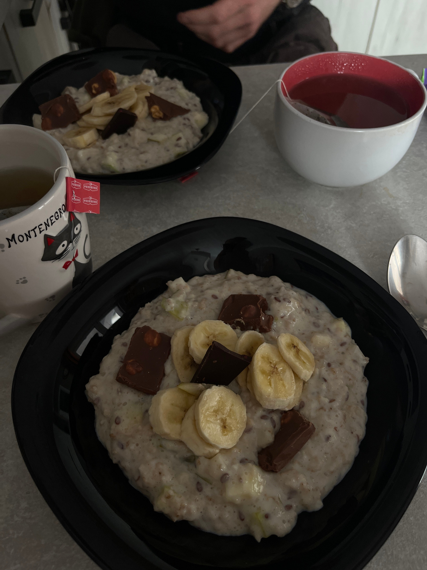 The image shows two bowls of porridge topped with banana slices and chocolate chunks, along with two mugs of tea. The scene is set on a grey surface. A spoon is visible near the larger bowl. One of th…read more