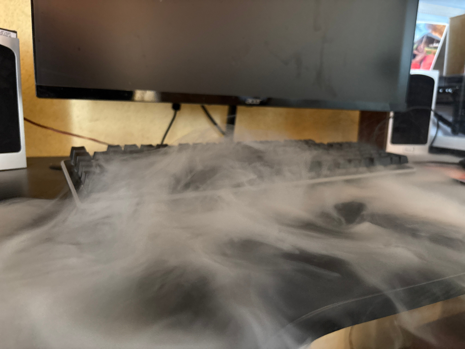 The image shows a computer setup consisting of a monitor, keyboard, and speakers, with smoke or vapor obscuring much of the view. The monitor is a dark color, with an "Acer" logo visible. The keyboard…read more