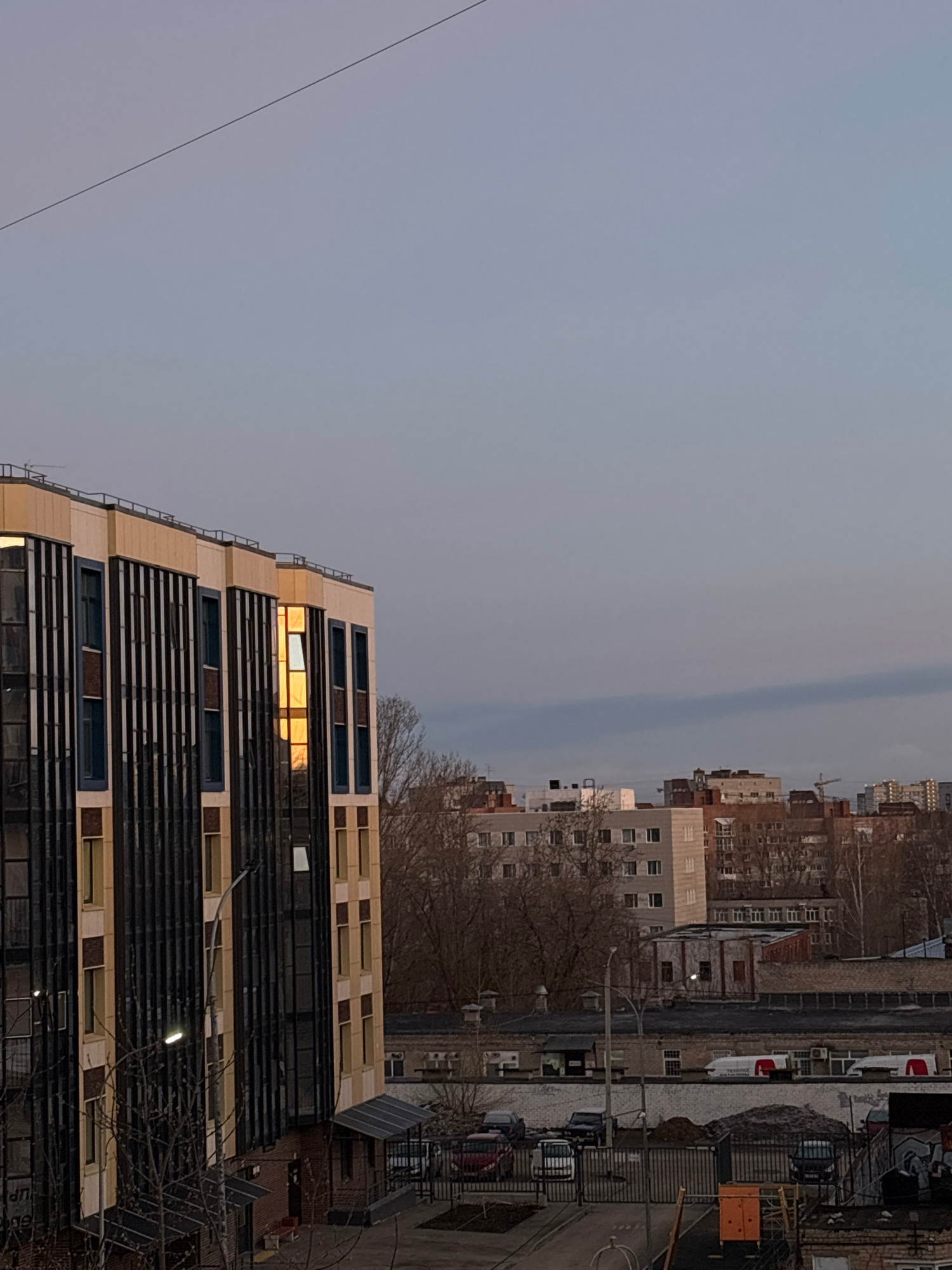 The image shows a cityscape of Perm, Russia, under a grey sky. A modern building with horizontal sunshades dominates the foreground, its windows reflecting a golden light. In the background, older bui…read more