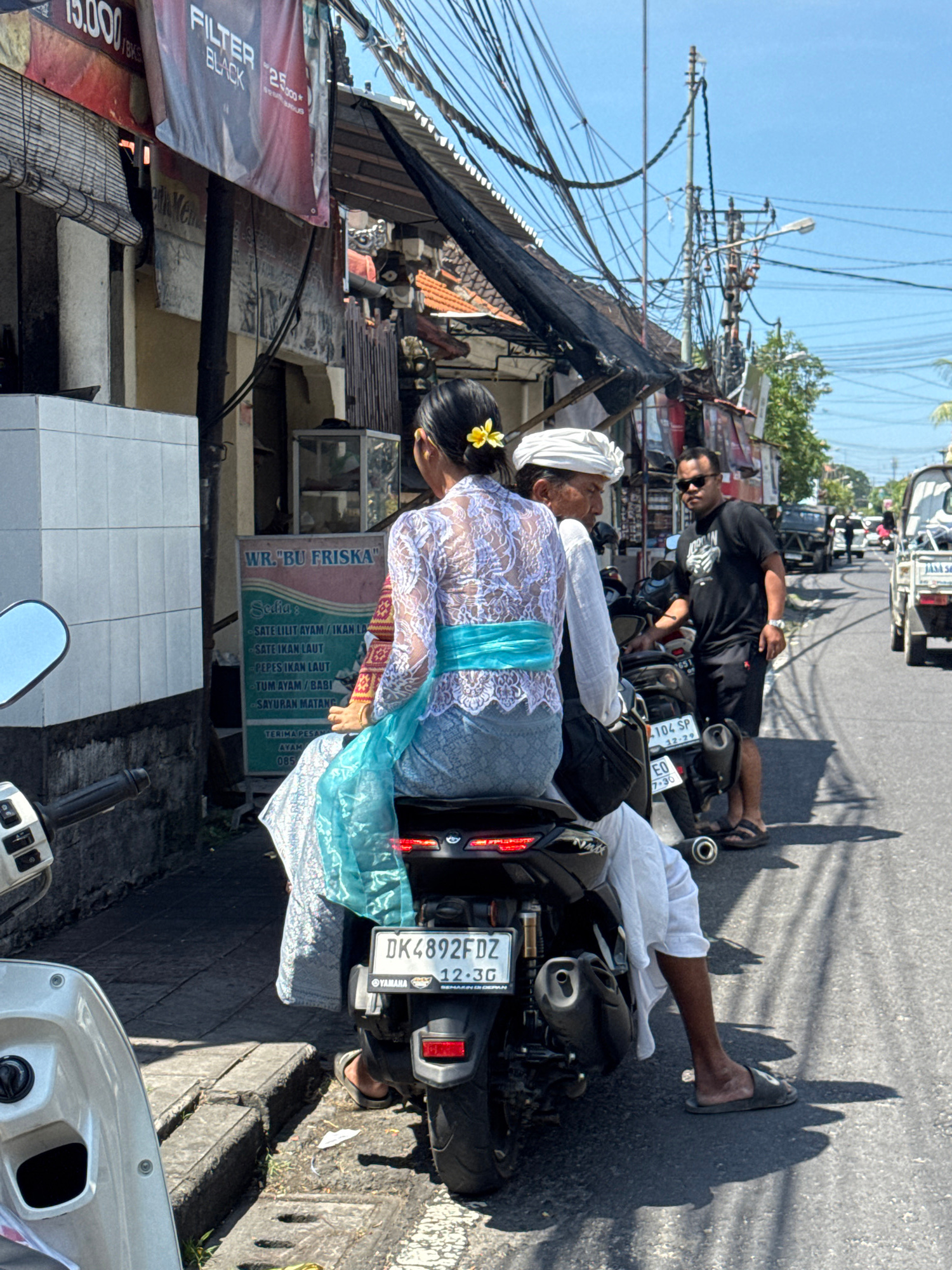 The image shows a street scene in Nusa Dua, Indonesia. A woman wearing traditional Balinese clothing and a yellow flower in her hair is seated on a black scooter with the license plate "DK 4892 FDZ".…read more