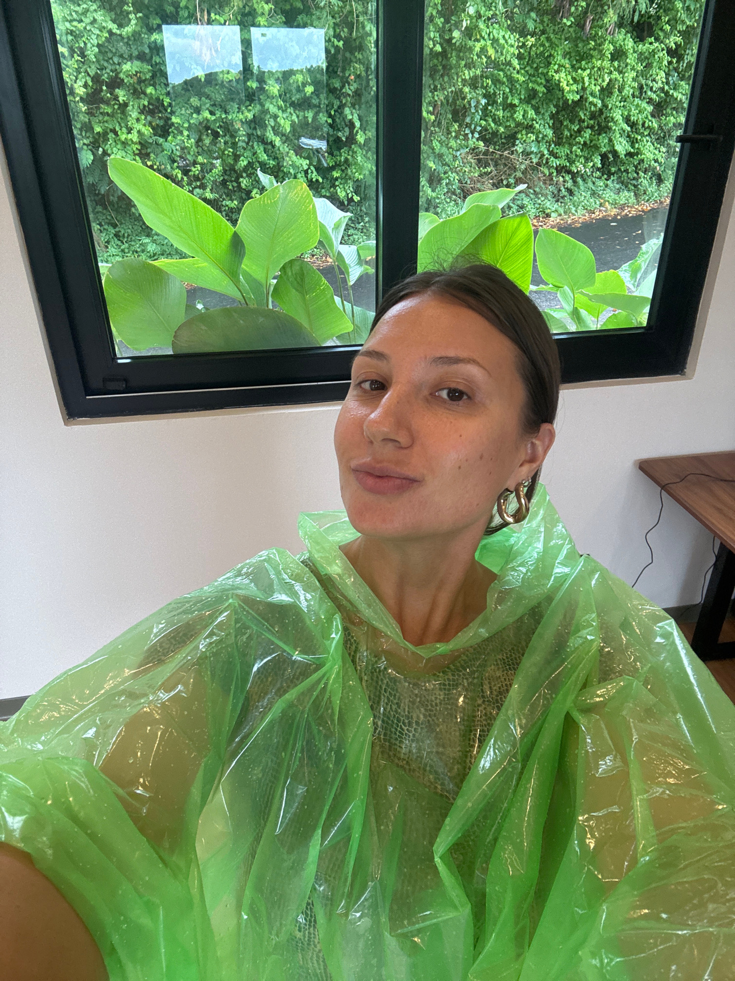 A woman is wearing a green, translucent plastic poncho, potentially for protection from rain or splashes. She is positioned indoors, with a window showing lush greenery outside. The window frame is bl…read more