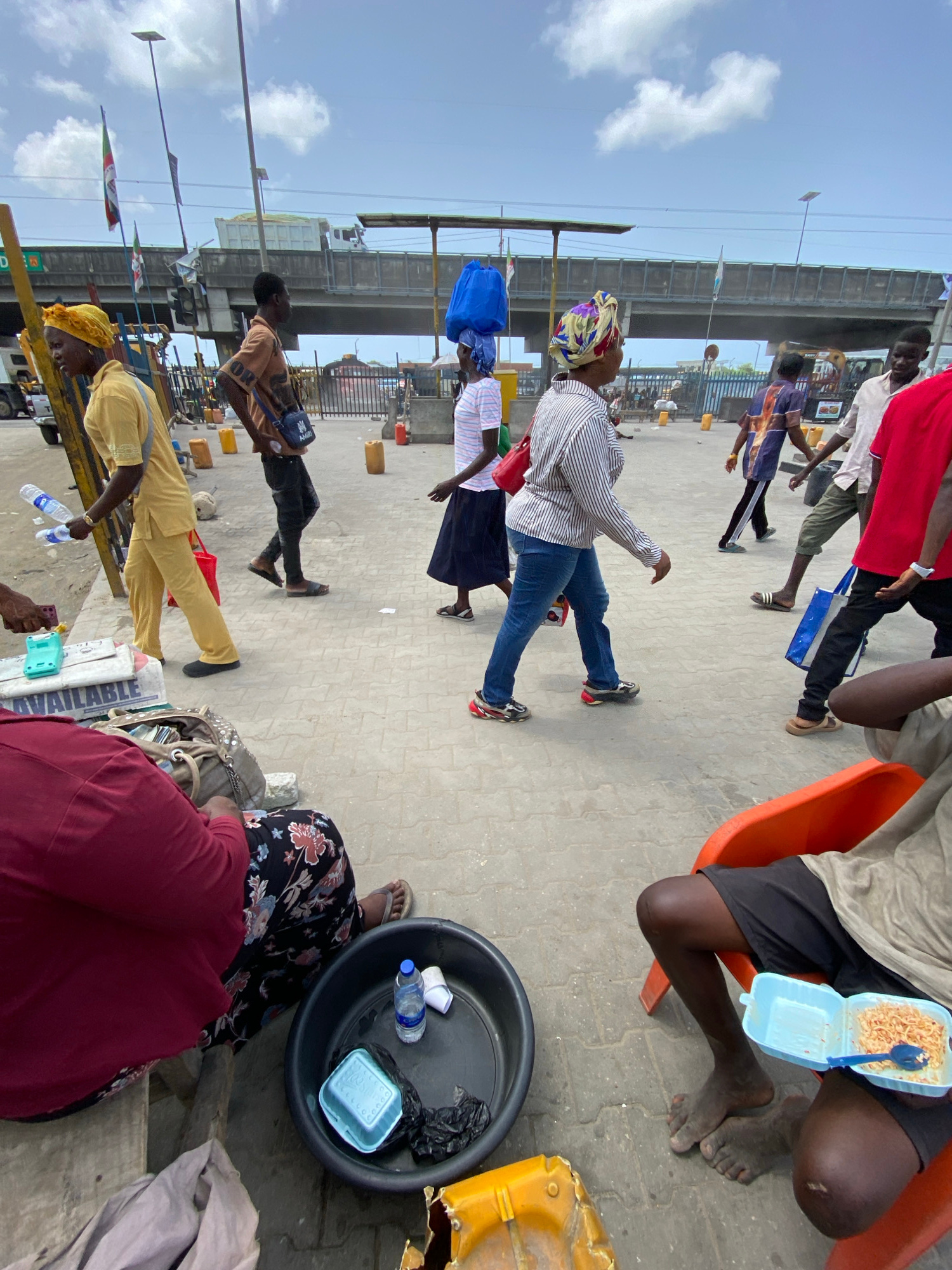 The scene is a busy, open-air public area in Lekki, Nigeria, likely a transit hub or market area under an elevated structure. **People:** A diverse group of individuals is present. Some are walking,…read more
