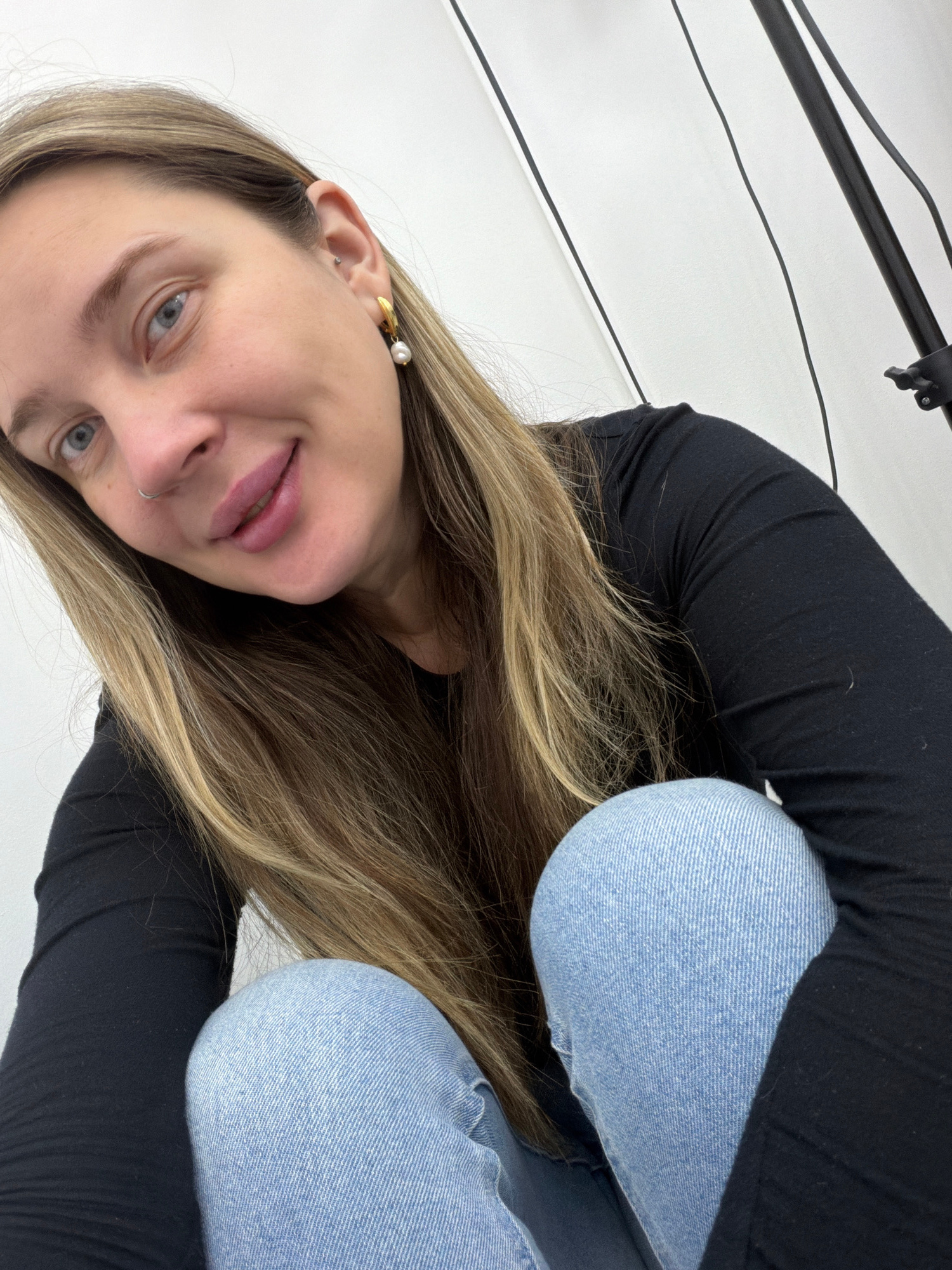 A woman is posing for a selfie. She is wearing a black long-sleeved shirt and light blue jeans. She is blonde with blue eyes. The background is a white wall with a black boom stand in the upper left c…read more