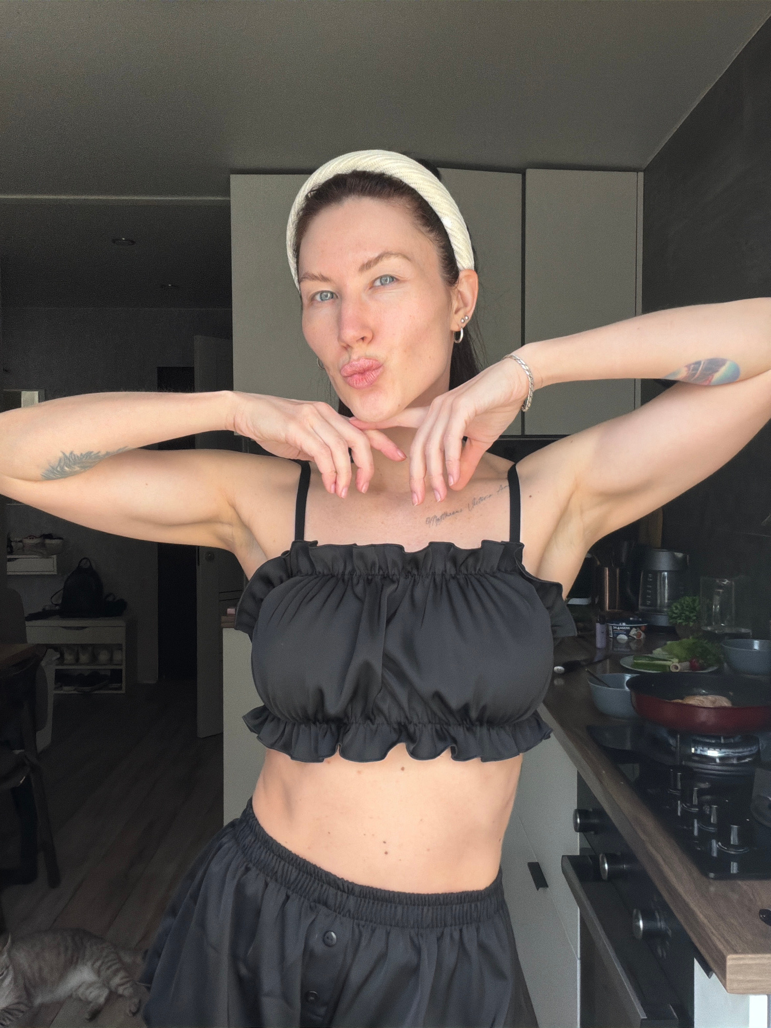 A woman with light eyes, a white headband, and two arm tattoos poses indoors. She is wearing a black, ruffled crop top and black pants with buttons. Her right arm is above her head, and her left arm i…read more