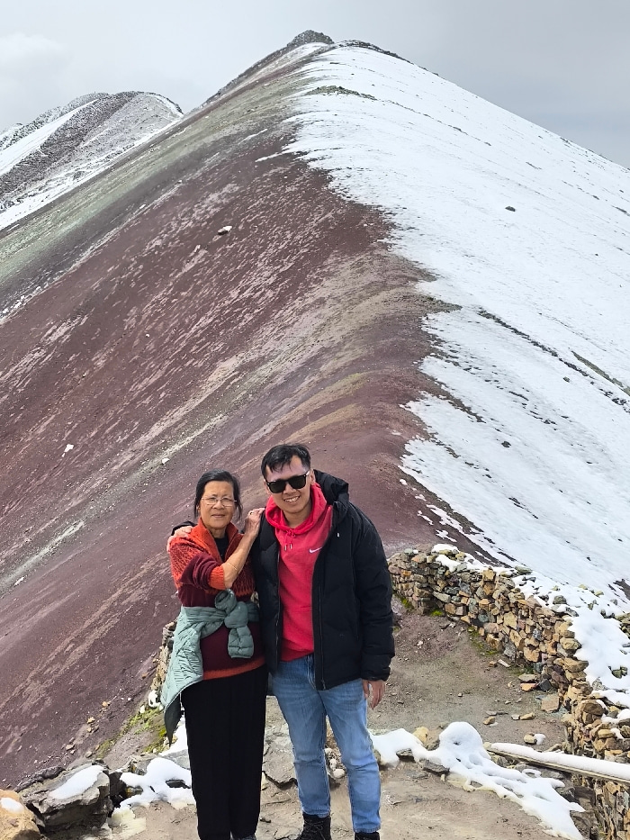Two people stand on a mountain ledge overlooking a vast landscape. An older woman in a maroon sweater and black pants poses with a younger man in a red hooded sweatshirt, blue jeans, and a black jacke…read more