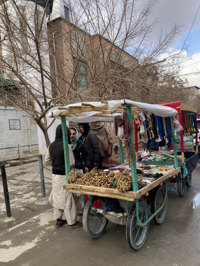 The image depicts an outdoor street scene in Quetta City Tehsil, Pakistan, under a cloudy sky. A green, four-wheeled mobile vending cart, featuring a wooden frame and a partial white plastic canopy, i…read more
