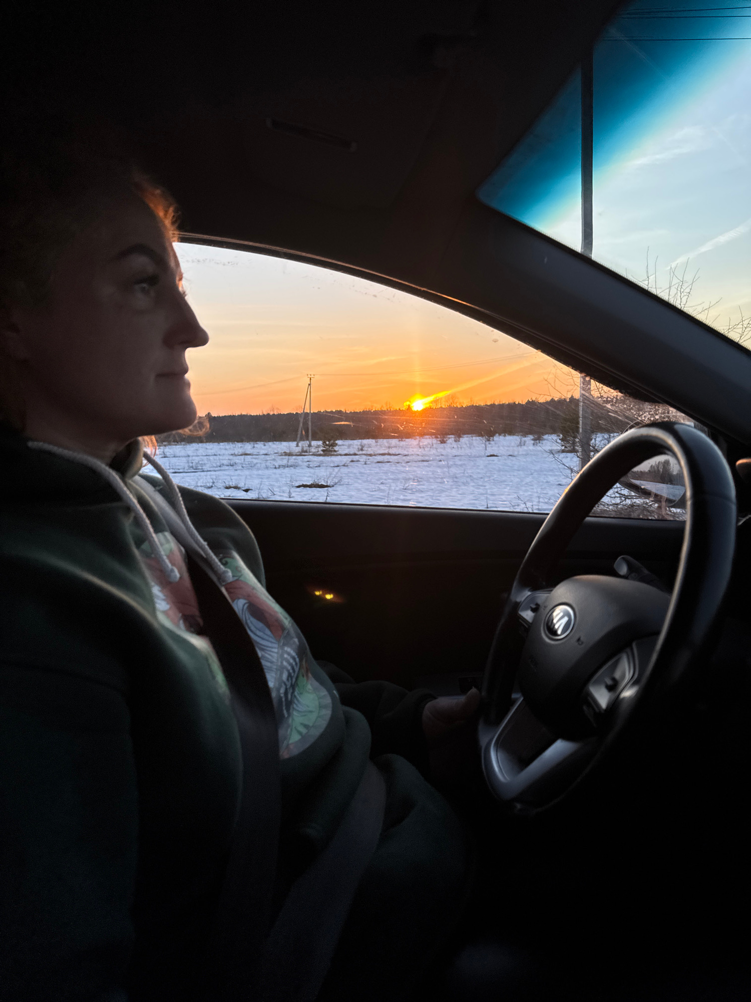A person lies reclined in the driver's seat of a car, looking out the open sunroof at a sunset over a snowy landscape. The steering wheel is visible in the foreground. A power line pole is visible on…read more