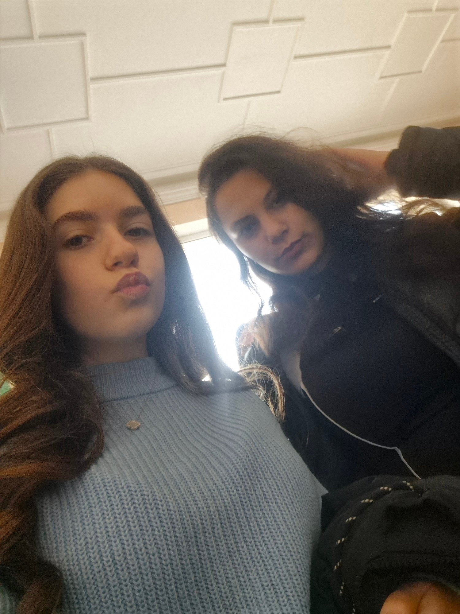 Two young women are in a selfie. The woman on the left is wearing a light blue sweater and has brown hair. The woman on the right is wearing a black top and has brown hair. The background is a white w…read more