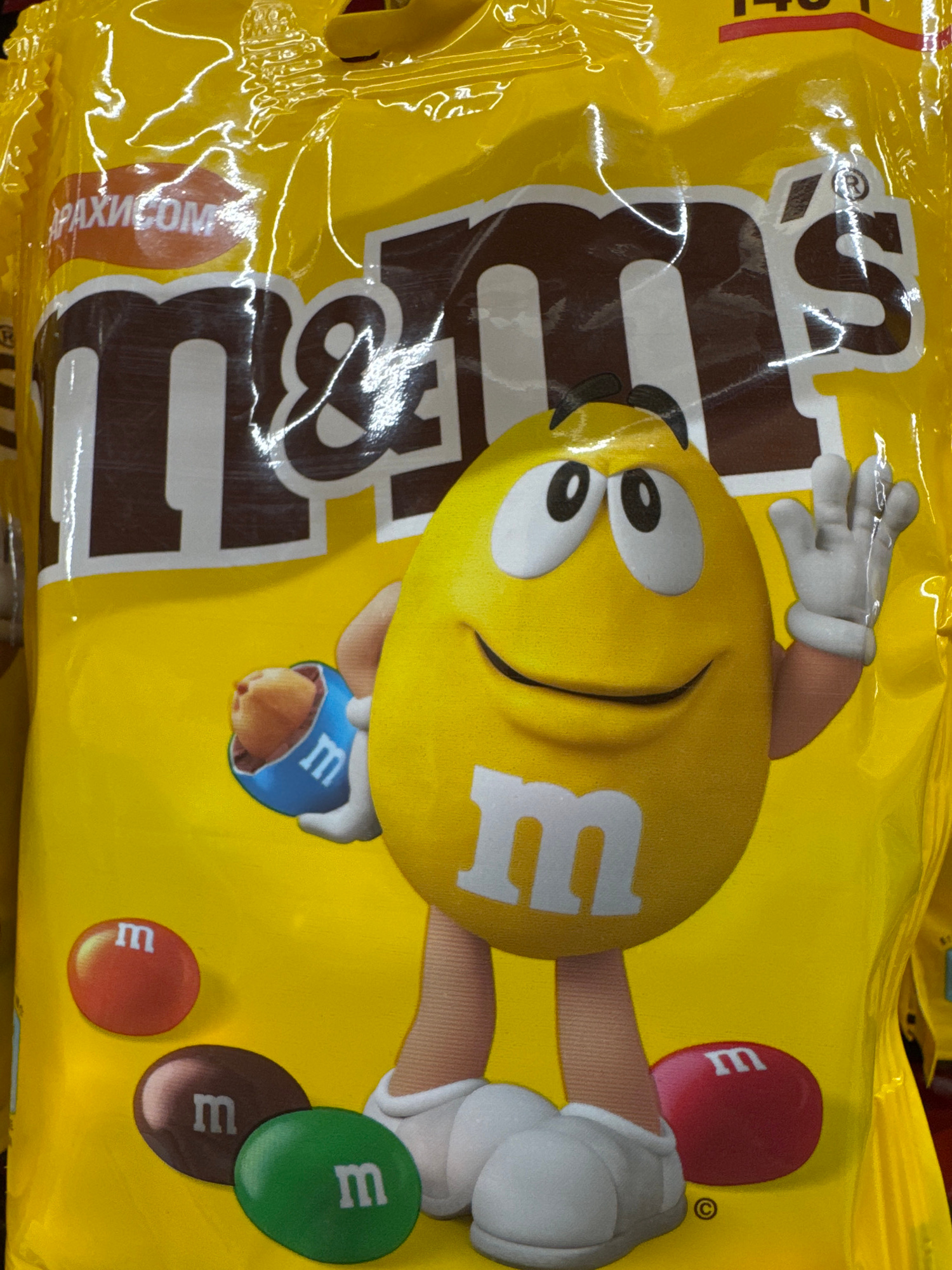 A close-up shot of a yellow M&M's bag with a cartoon of a yellow M&M character on it. The bag contains peanut M&M's, as indicated by the Russian inscription "АРАХИСОМ". The colors of the M&M's candies…read more