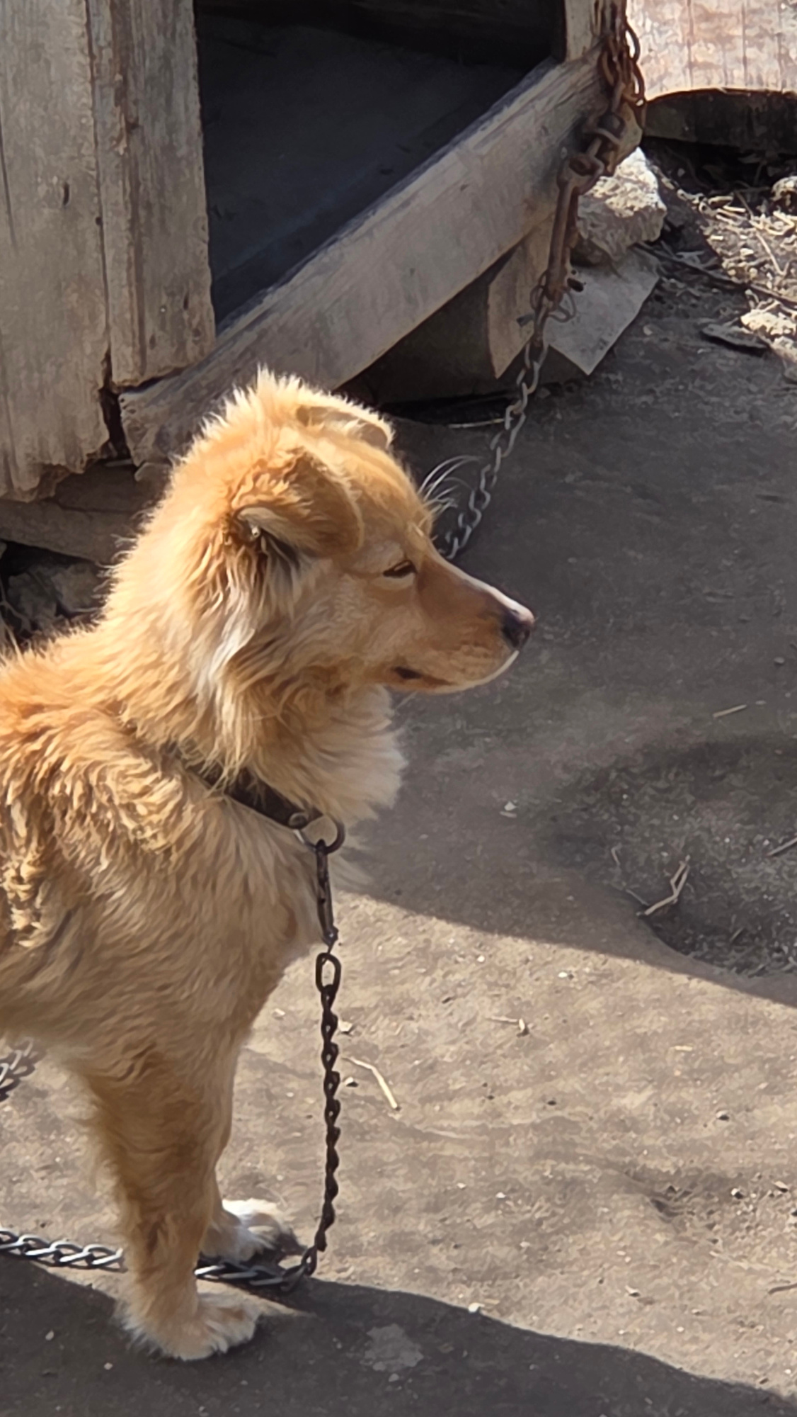 A golden-colored dog, wearing a collar and attached to a heavy chain, is straining upward with its head tilted back. The chain is connected to a weathered wooden structure, possibly a well or enclosur…read more