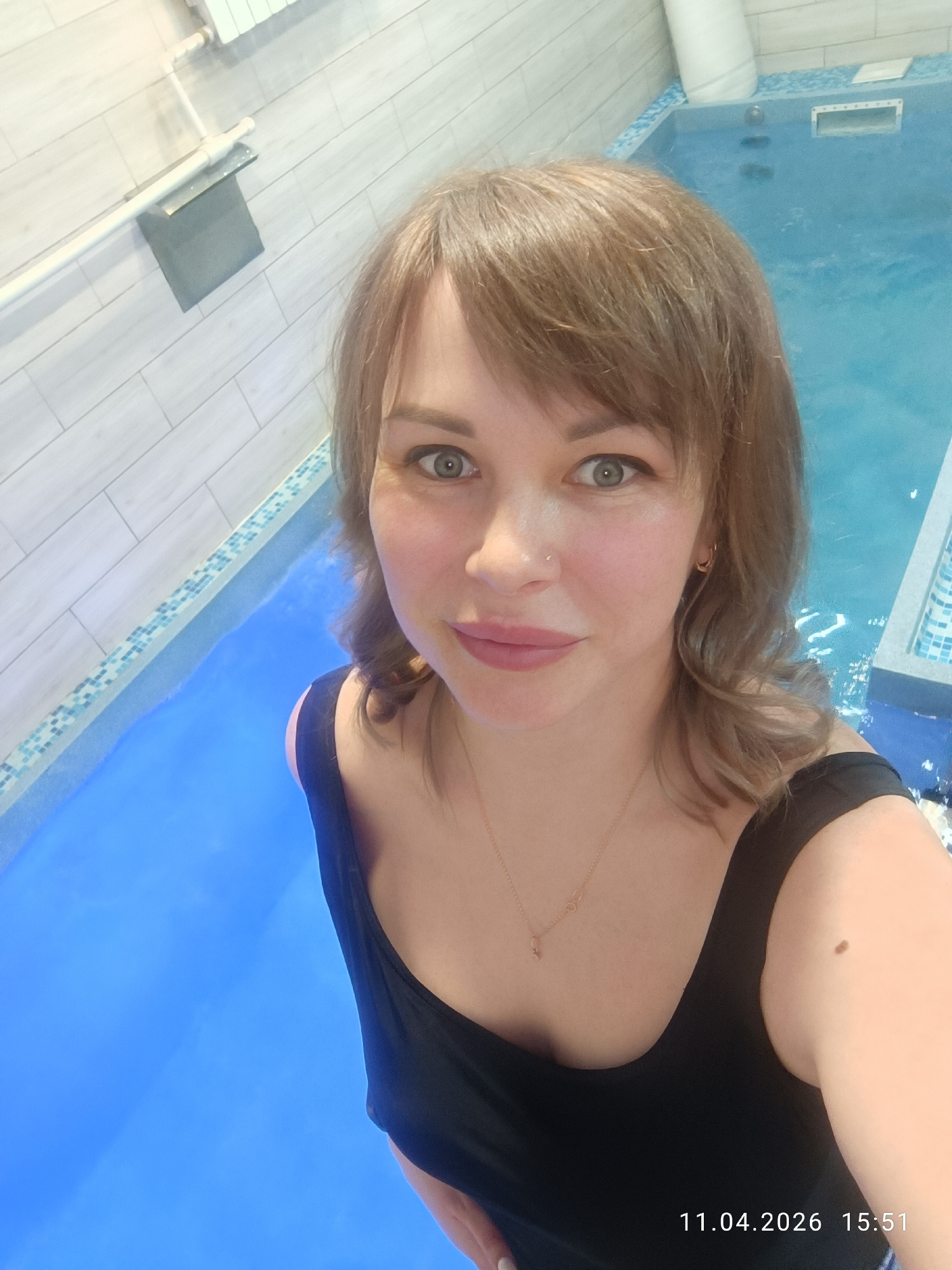 A medium close-up photograph depicts a woman indoors adjacent to a blue-tiled pool. The woman is fair-skinned with hazel eyes and shoulder-length brown hair. She wears a black tank top and a thin gold…read more