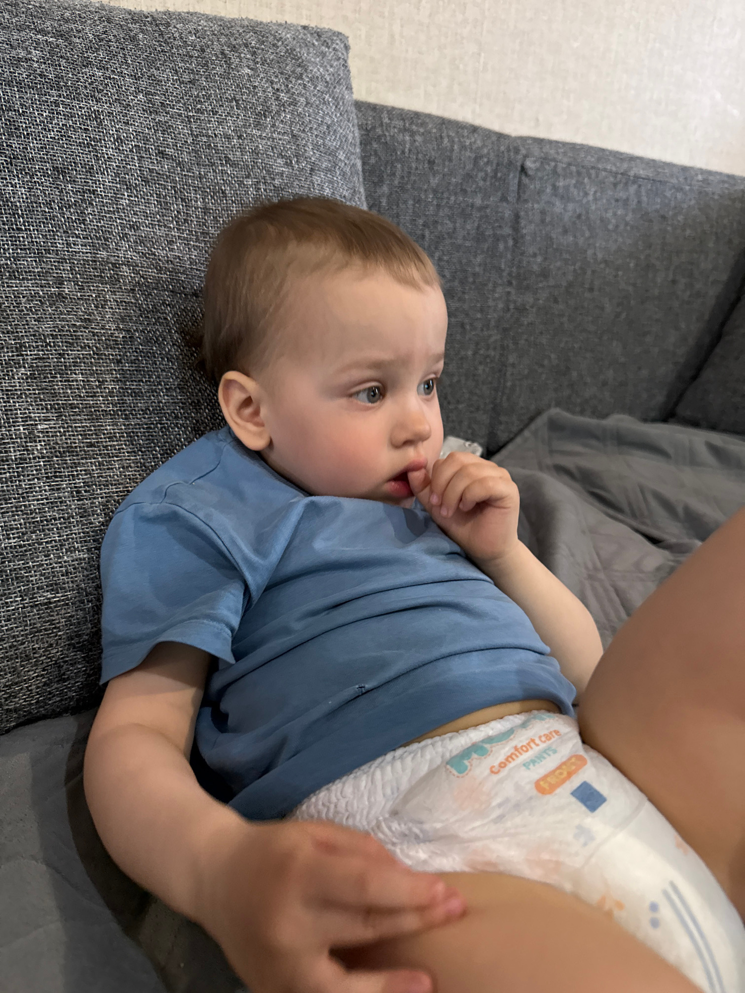 A baby wearing a blue shirt and a diaper is lying on a gray upholstered sofa. The location is likely indoors. There is no information to confirm the city of Rusanovo, Russia.