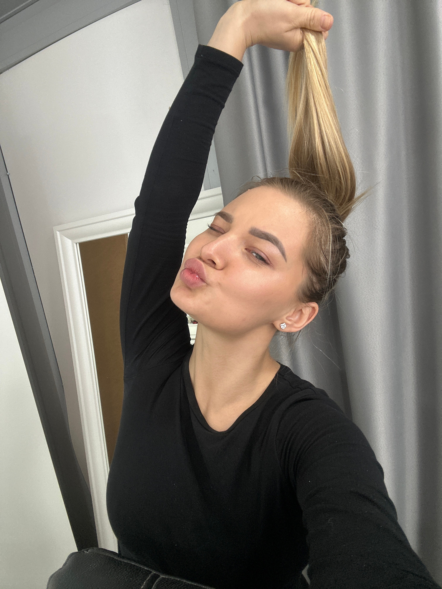 A young woman with light skin and blonde hair pulled into a high ponytail is holding the end of her ponytail in her left hand. She is wearing a black long-sleeved shirt and a small square earring in h…read more