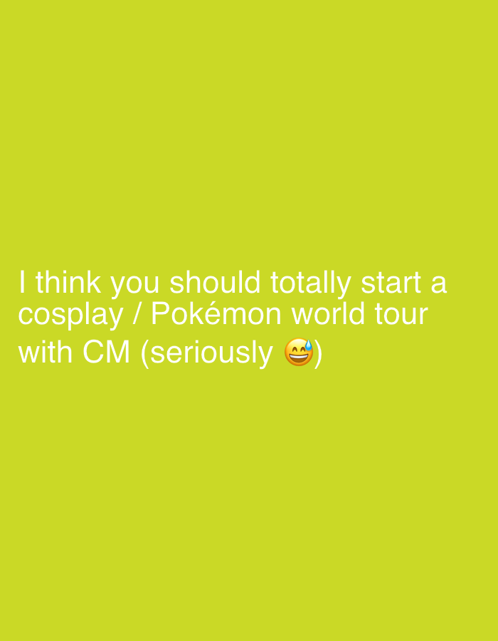 The image is a light greenish-yellow background with white text that reads: "I think you should totally start a cosplay / Pokémon world tour with CM (seriously) 😅)".