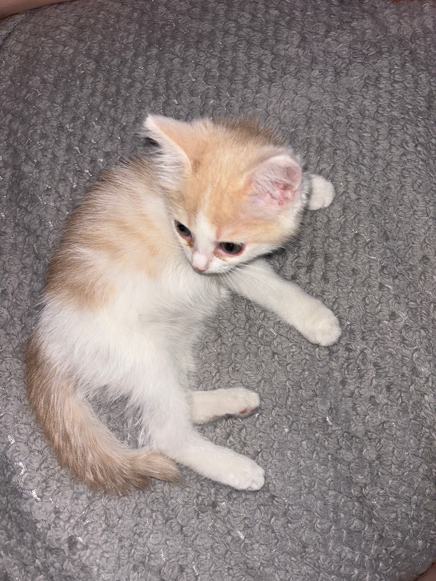 A small kitten with white and cream-colored fur is lying on its back or side on a textured grey blanket. The kitten is curled up, with one front paw extended upwards and its head turned to the side, l…read more