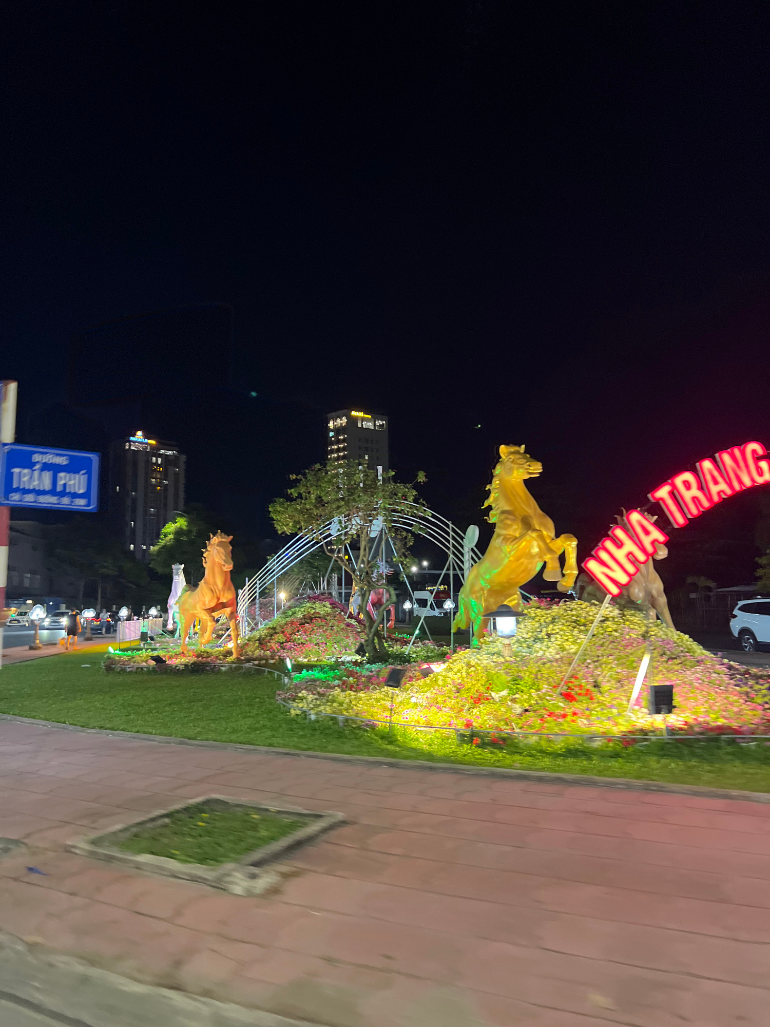 At night, the Nha Trang street art installation displays golden horses, flowers, and neon signs spelling out "NHA TRANG". Street sign reads "TRÁN PHÚ" . Buildings and street lights are visible in the…read more
