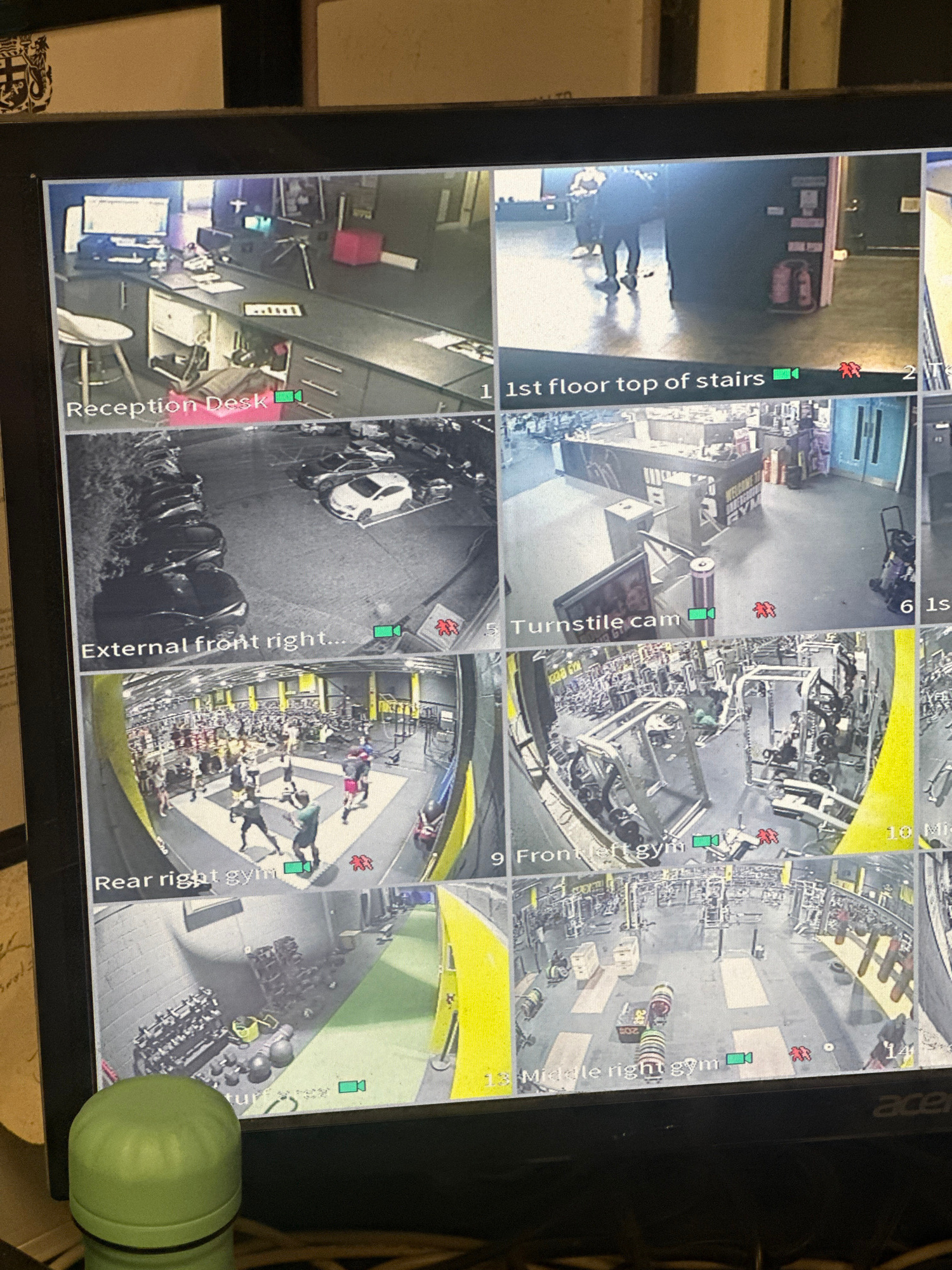 The image displays a monitor showing a 3x5 grid of CCTV camera feeds originating from a gym facility identified as "Kidd GBR Gym" in Tunbridge Wells, United Kingdom. A light green, cylindrical object…read more