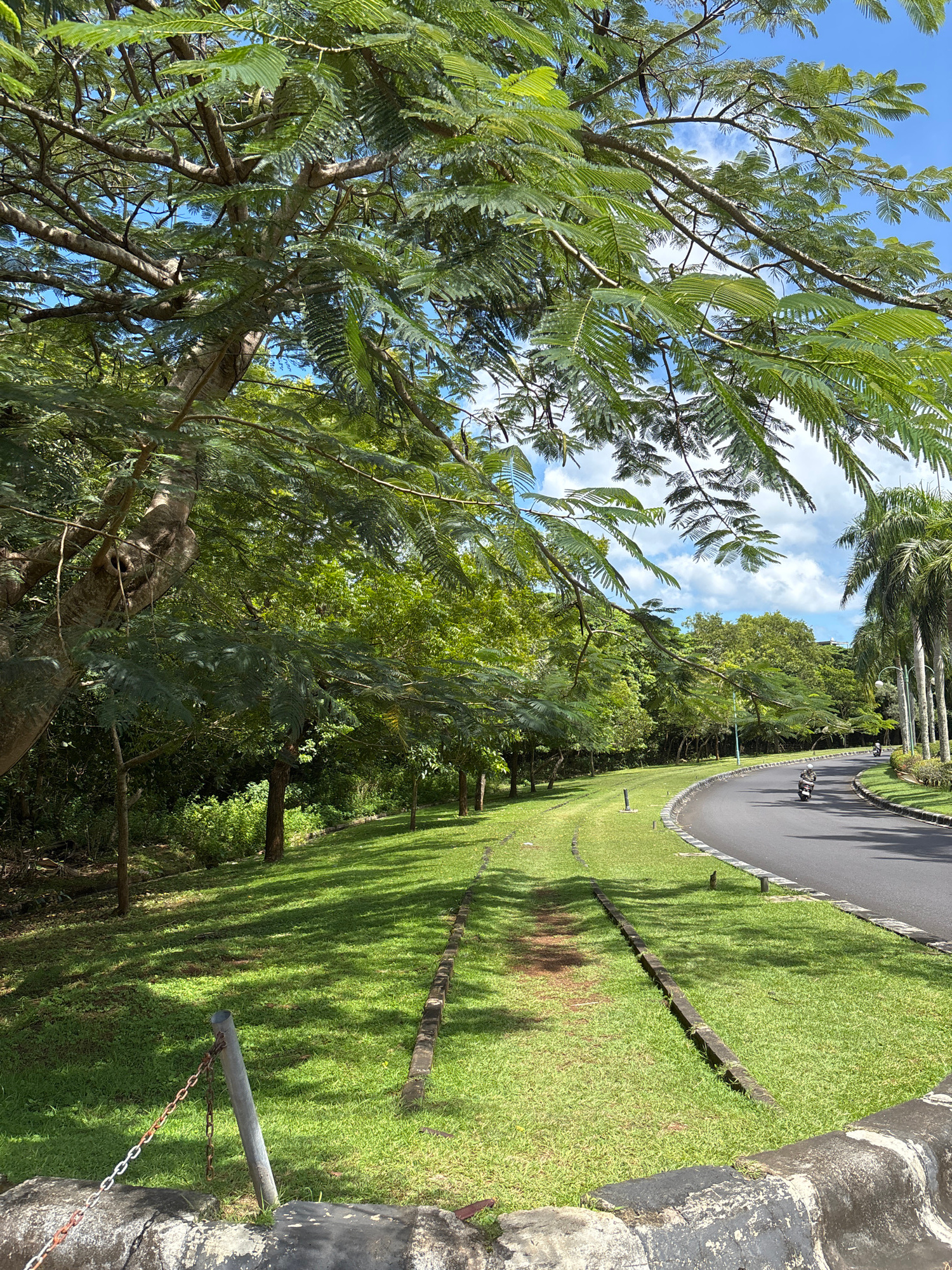 The image depicts a park or green space in Pecatu, Indonesia, characterized by lush greenery, trees, and a pathway. In the foreground, a large tree with distinctive, fern-like leaves dominates the lef…read more