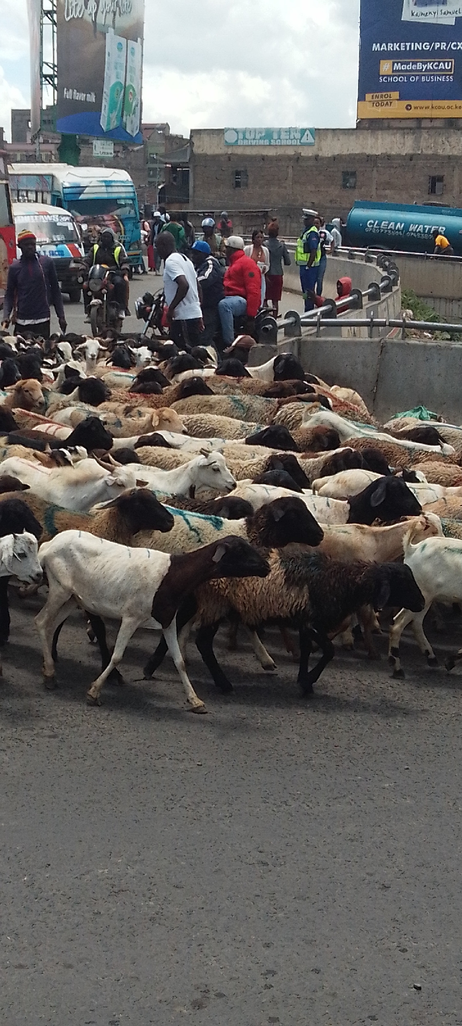 The image shows a large flock of sheep crossing a road in a city, likely Nairobi, Kenya, based on the visible billboards. The sheep are of various colors, including white, brown, and black. Several pe…read more