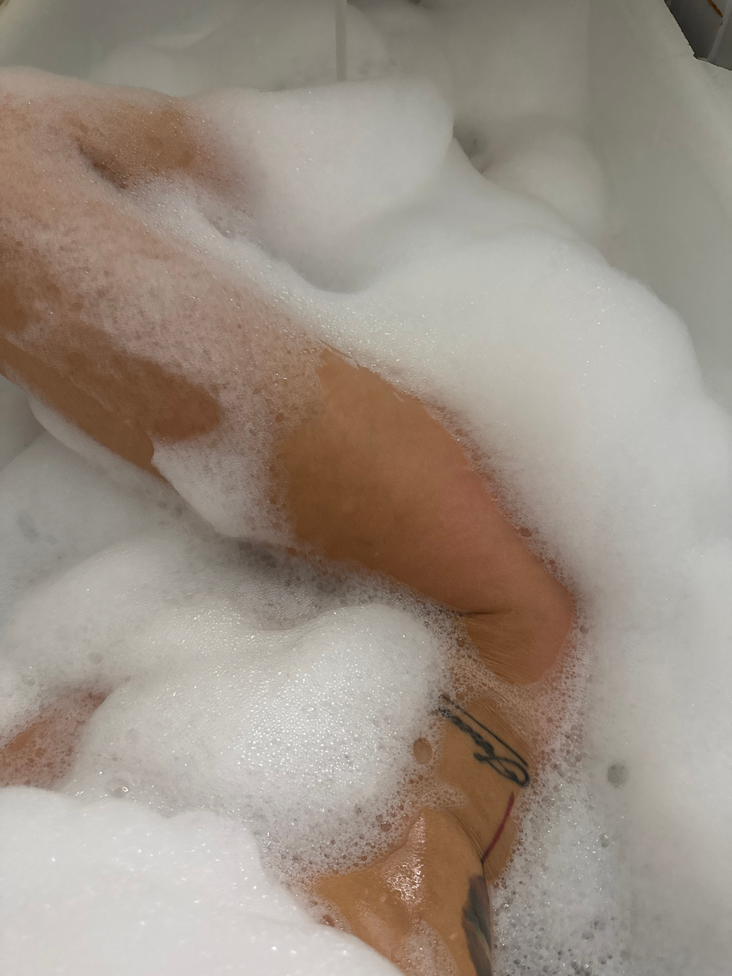 The image depicts a close-up view of a person taking a bubble bath in an indoor setting, likely in Chaikovsky, Russia. The main subjects are the person's legs and lower torso, partially submerged and…read more