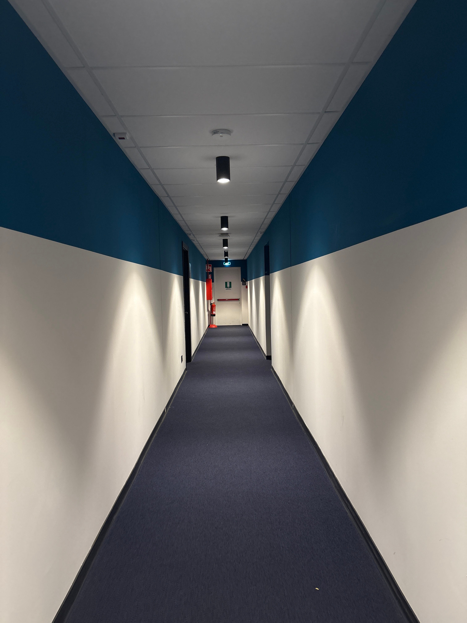 The image depicts an interior corridor with a distinct color scheme of white and dark blue. The left wall is primarily white with a vertical dark blue stripe along the floor level, interspersed with c…read more