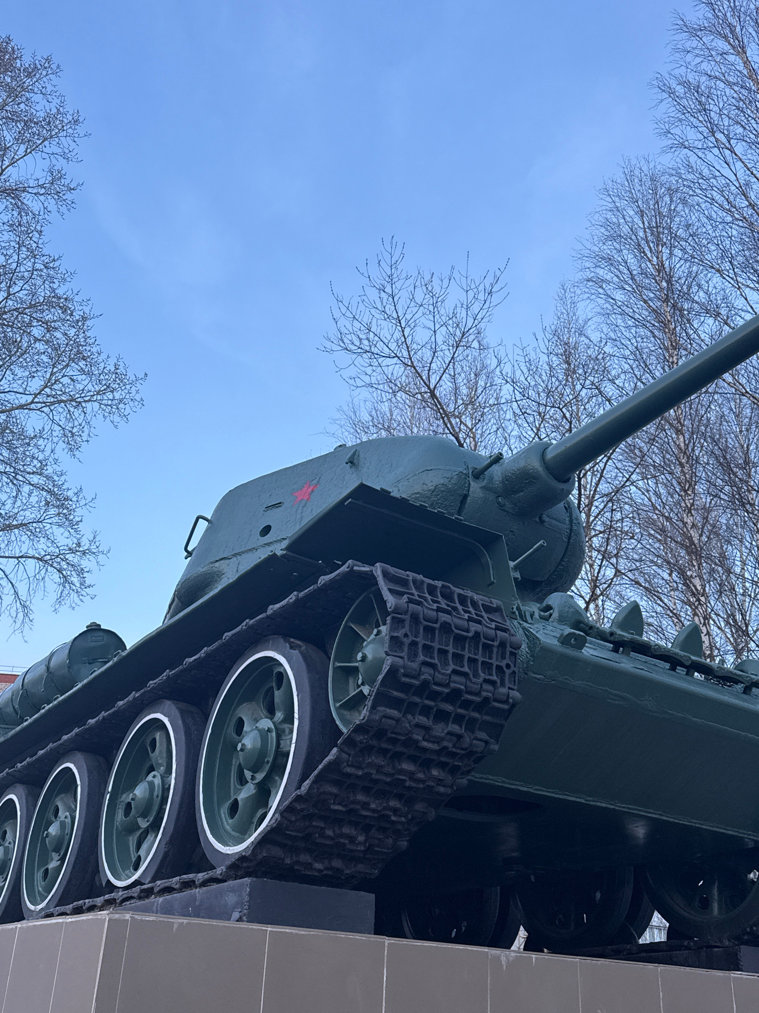 The image shows a green military tank positioned outdoors, likely on display, with a blue sky and bare tree branches visible in the background. The tank has a long barrel pointed upwards and features a prominent track system with visible wheels. A red star is painted on the side of the tank turret. The perspective is a low-angle shot, emphasizing the tank's size. Based on publicly available information, this likely represents the T-34 tank memorial in Chernushka, Russia. | Open Wire