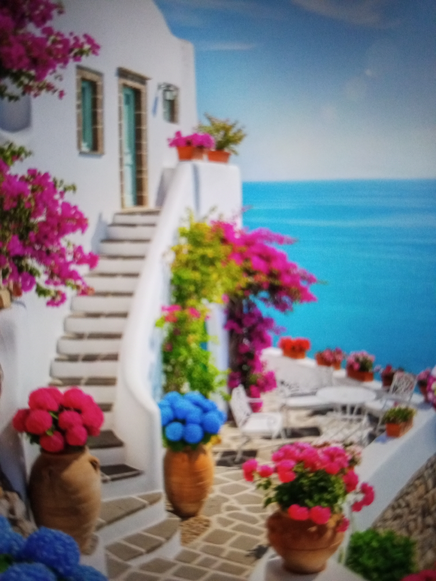 The image depicts a scene reminiscent of the Greek Islands, possibly Santorini, but **not** the city of Tinaquillo, Venezuela. The architecture features white buildings with blue accents. A staircase…read more