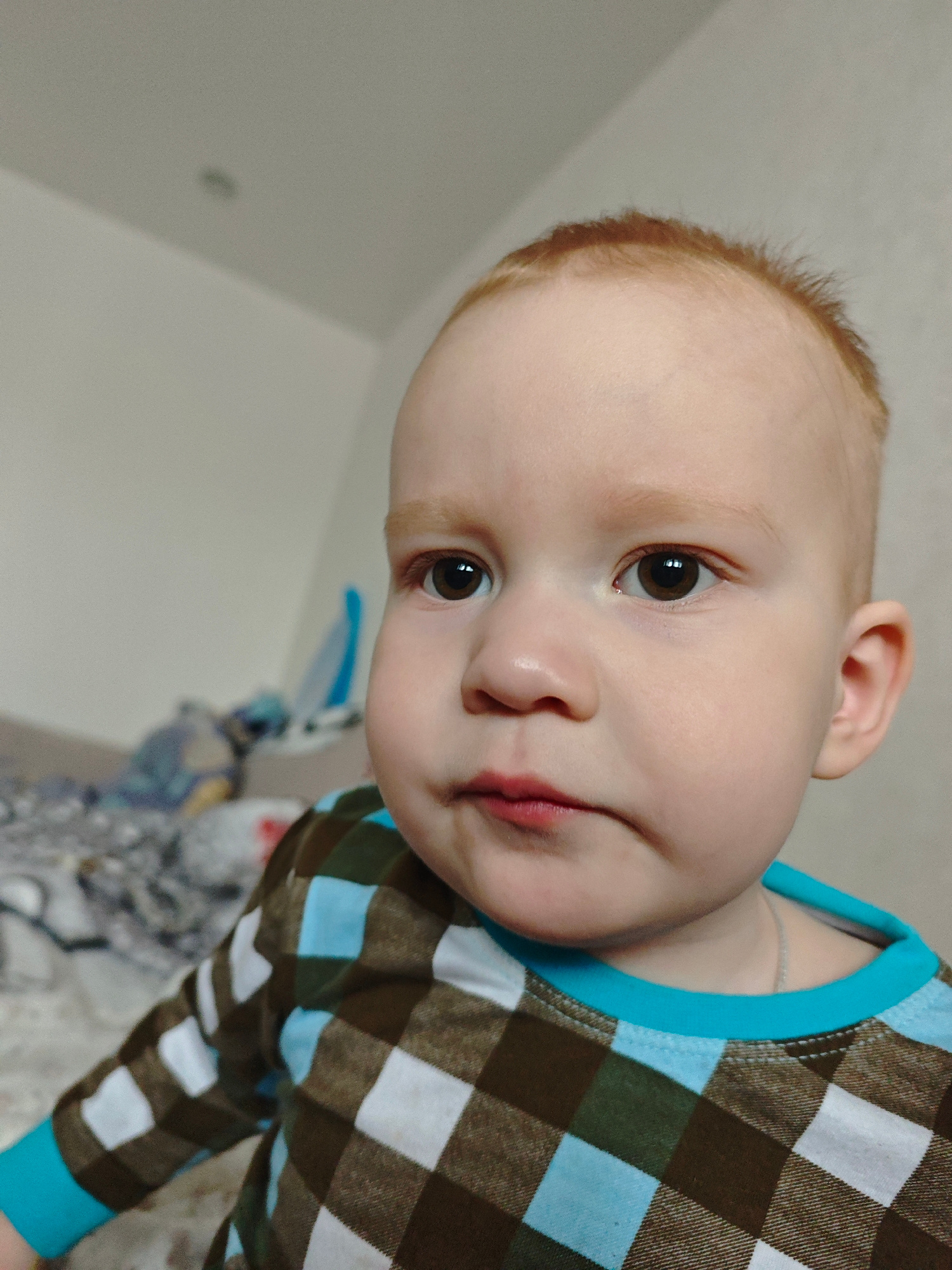 A close-up shot shows a toddler with light skin, red hair, and brown eyes. The child is wearing a long-sleeved shirt with a blue and brown checkered pattern and a blue collar. A silver necklace is vis…read more