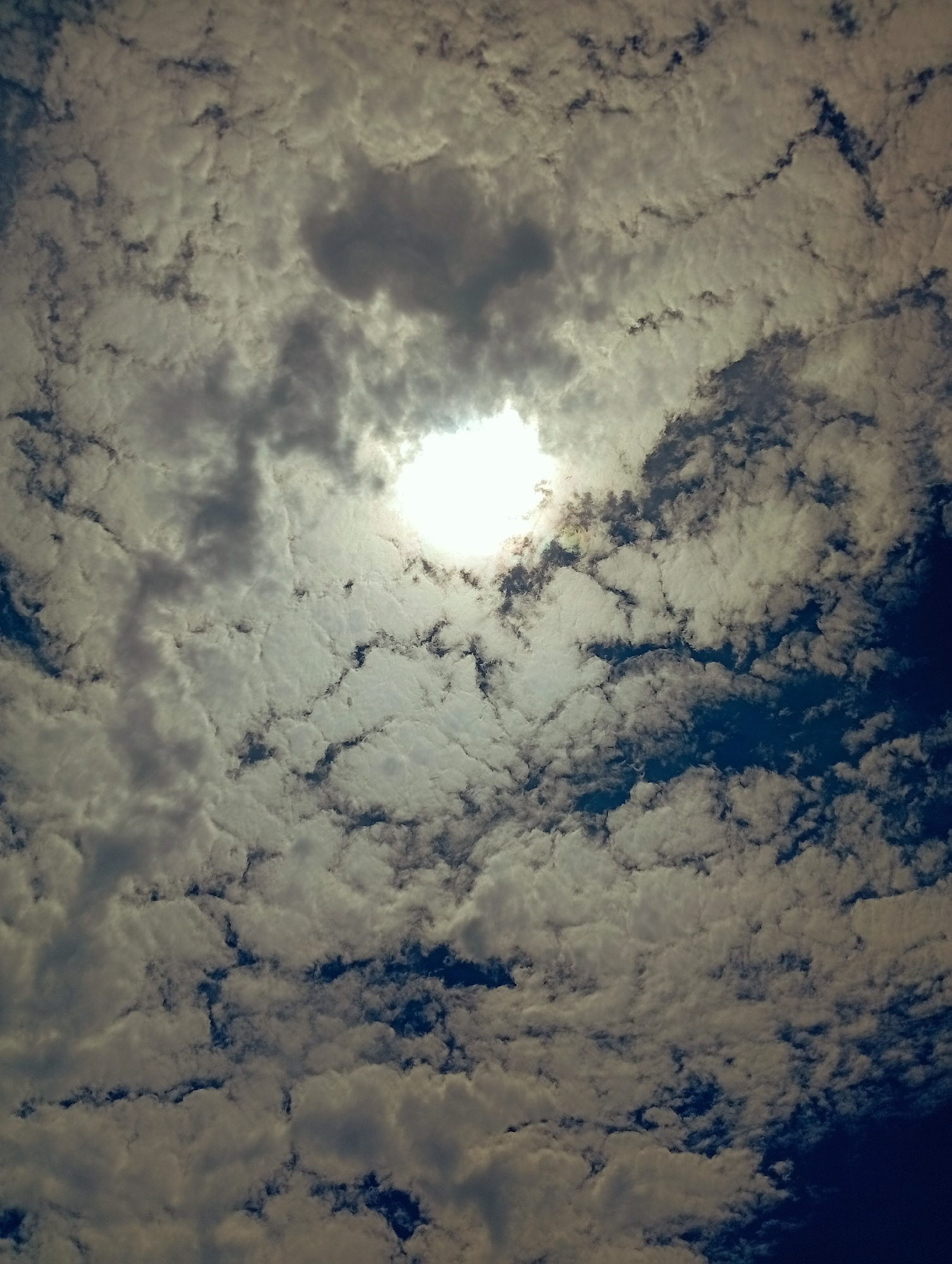The image is a shot looking upwards at a cloudy sky with the sun partially obscured. The clouds are dense and appear to be altocumulus, with blue sky visible between them. The sun is a bright spot neaβ¦read more
