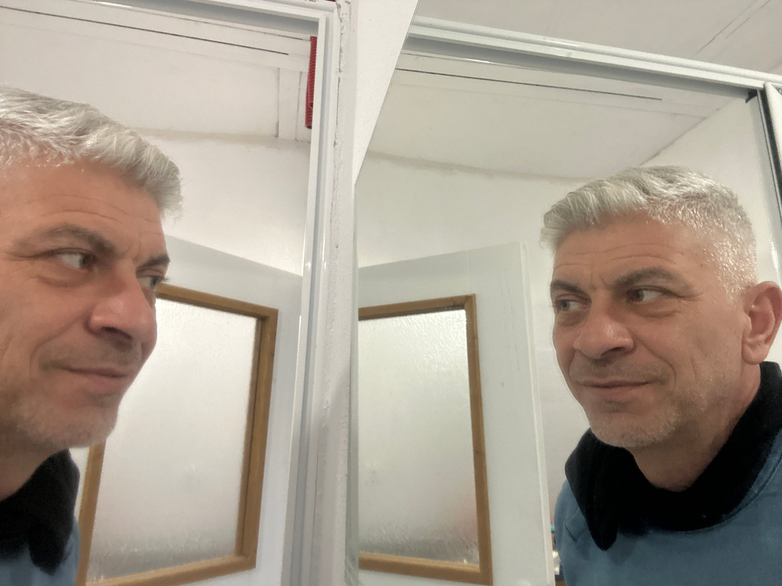 The image shows a man's face reflected in two adjacent mirrors. The man has gray hair and is wearing a dark collar. The mirrors have white frames with brown accents. The background appears to be a whi…read more