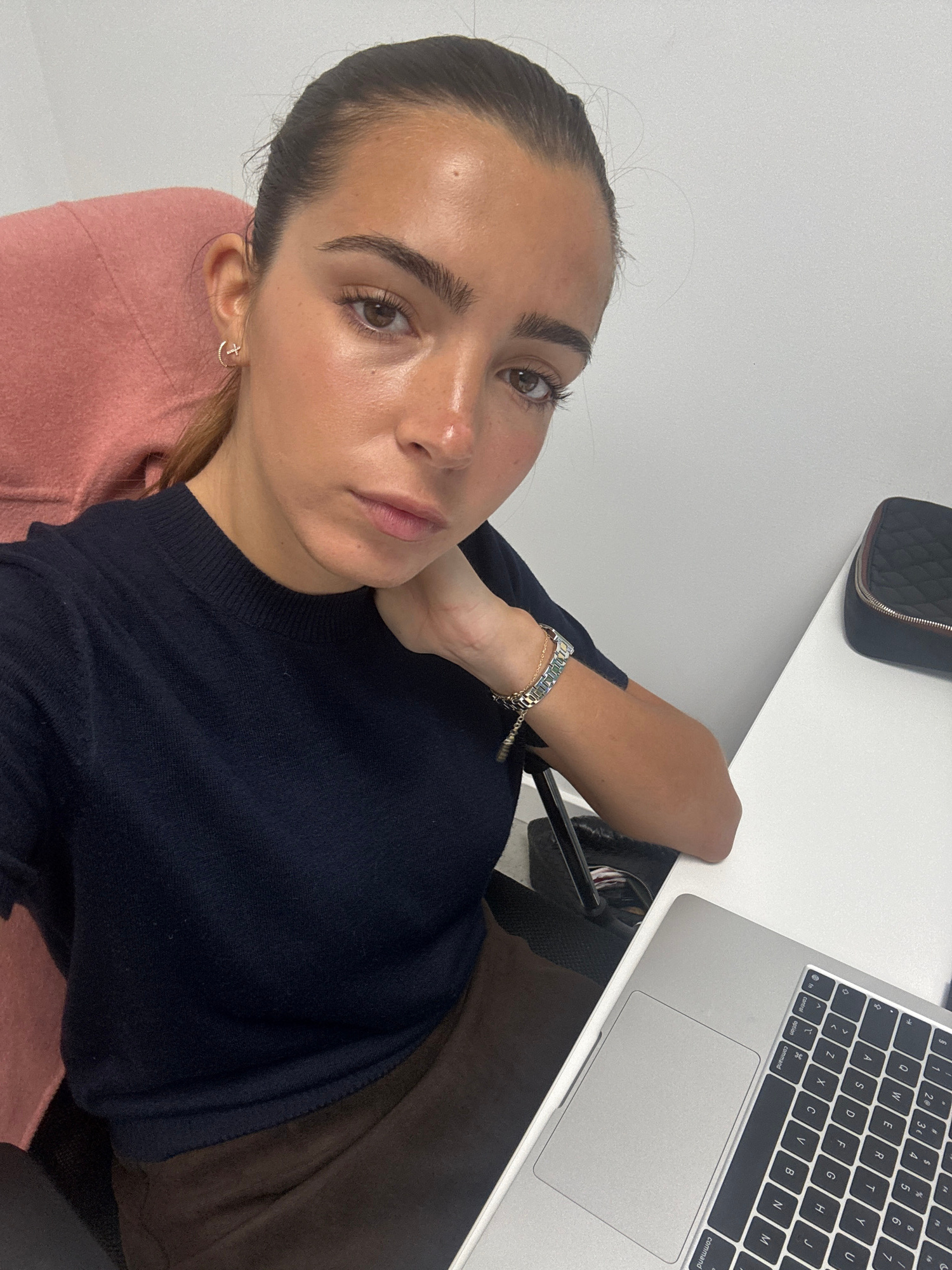 A medium-shot, angled selfie captures a woman seated at a white desk with a laptop. She has dark hair pulled back, fair skin, and wears a dark blue sweater. A pink garment is visible beneath the sweat…read more