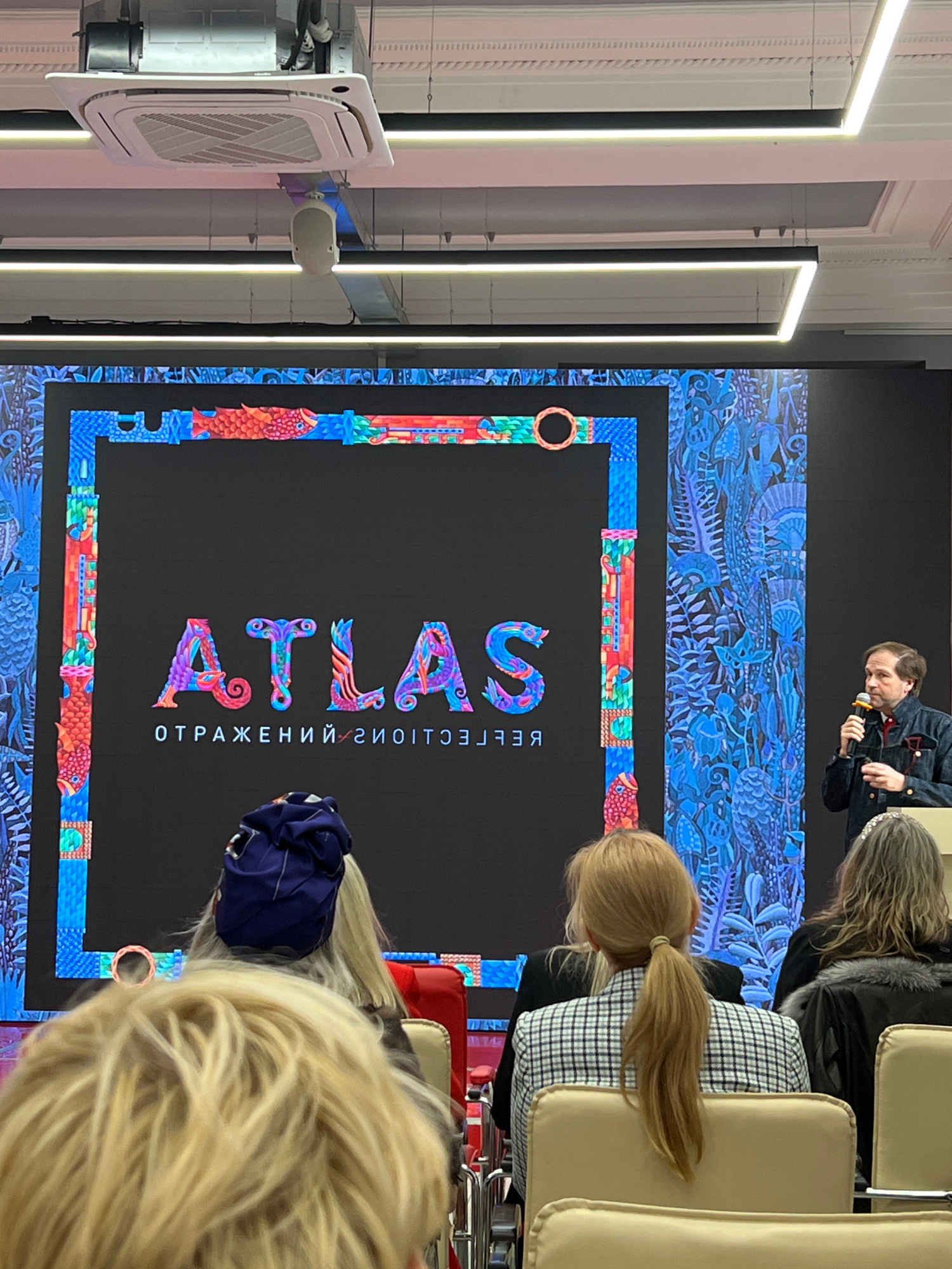The image shows a presentation in Saint Petersburg, Russia. A presenter speaks into a microphone to an audience. Behind the presenter is a large screen displaying the word "ATLAS" in a stylized font w…read more