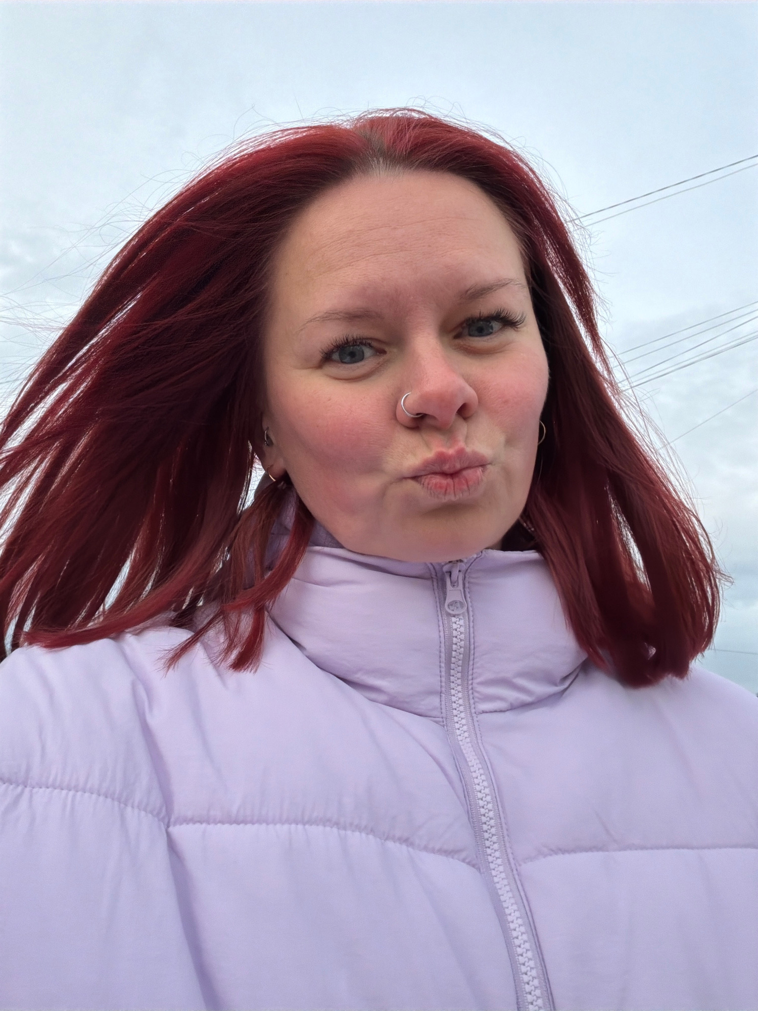 A selfie of a woman with auburn hair and blue eyes, wearing a lavender-colored puffer jacket, with a nose ring, pursing her lips, likely taken outside. Overhead power lines are visible in the sky. Theβ¦read more