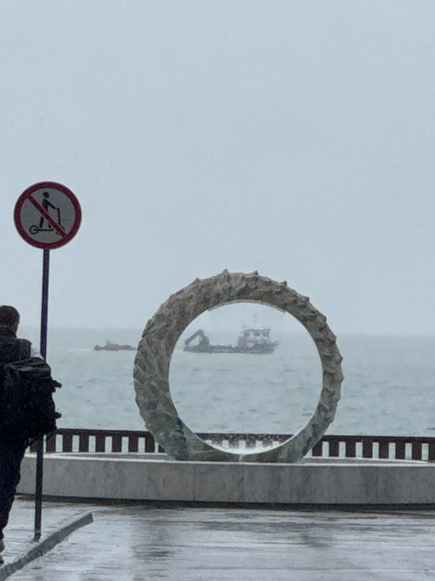 The image shows a scene in Sochi, Russia. There is a circular, decorated monument with a clear center, through which a body of water and what appears to be a small boat or structure on the water can b…read more