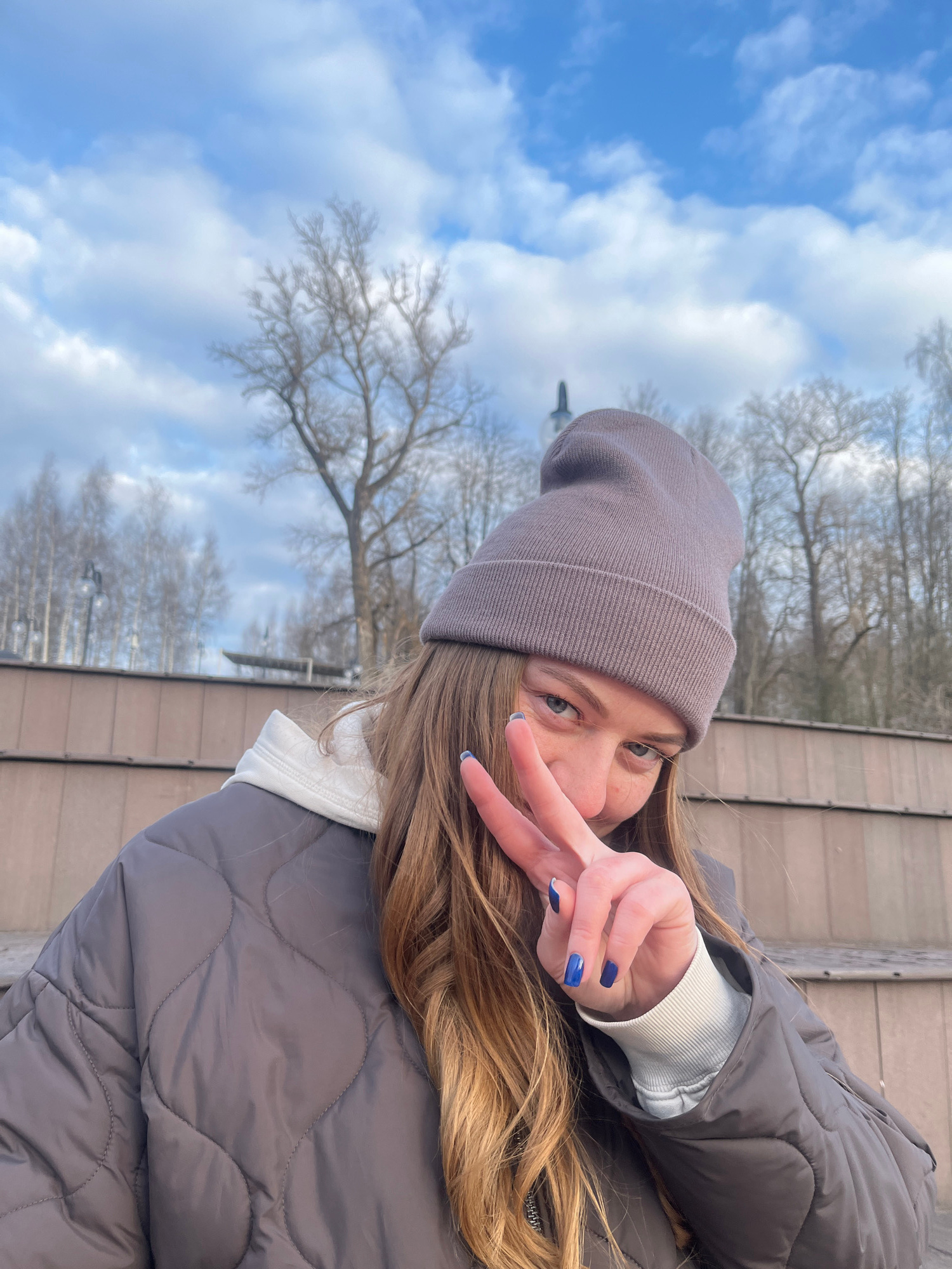 A young woman in a gray beanie and a puffy gray jacket poses for a photo. She is holding up two fingers in a peace sign. Her fingernails are painted blue. The background shows bare trees, a blue sky w…read more
