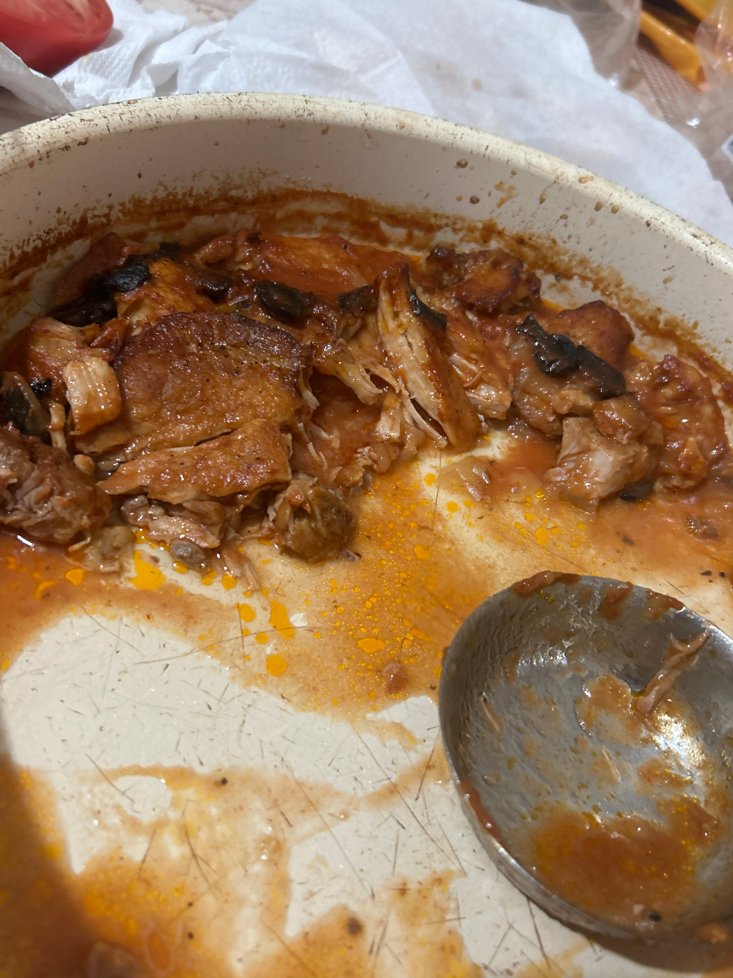 The image depicts a partially eaten meal in a ceramic pan. The food remnants appear to be some kind of meat stew with a reddish-brown sauce and possibly mushrooms. A metal spoon sits in the pan, also…read more