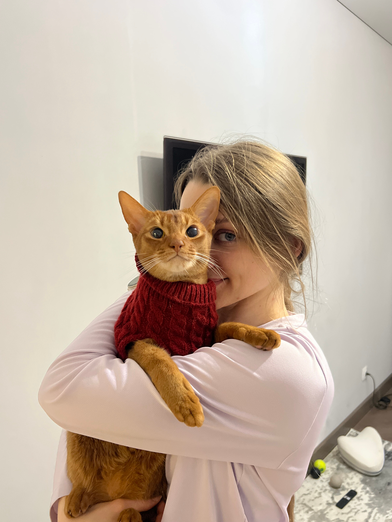 An indoor vertical shot captures a woman holding a cat in what appears to be a cozy home in Kazan, Russia. The woman, with blonde hair, is partially visible, smiling gently with her left eye and cheekβ¦read more