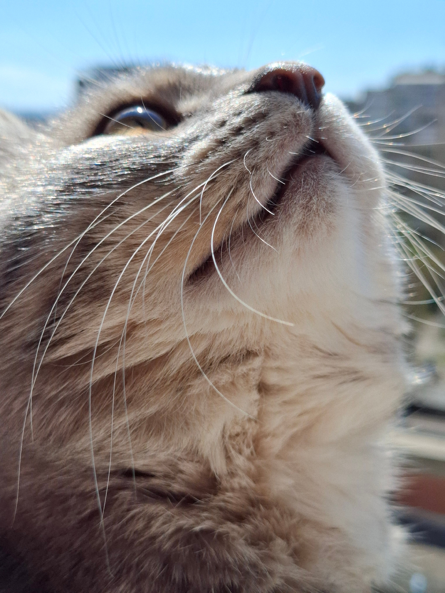 Close-up, tilted shot of a cat's face, nose pointing upwards toward a blue sky. The cat has gray and white fur with long, prominent white whiskers. Its right eye, visible in the lower left, has a blue…read more