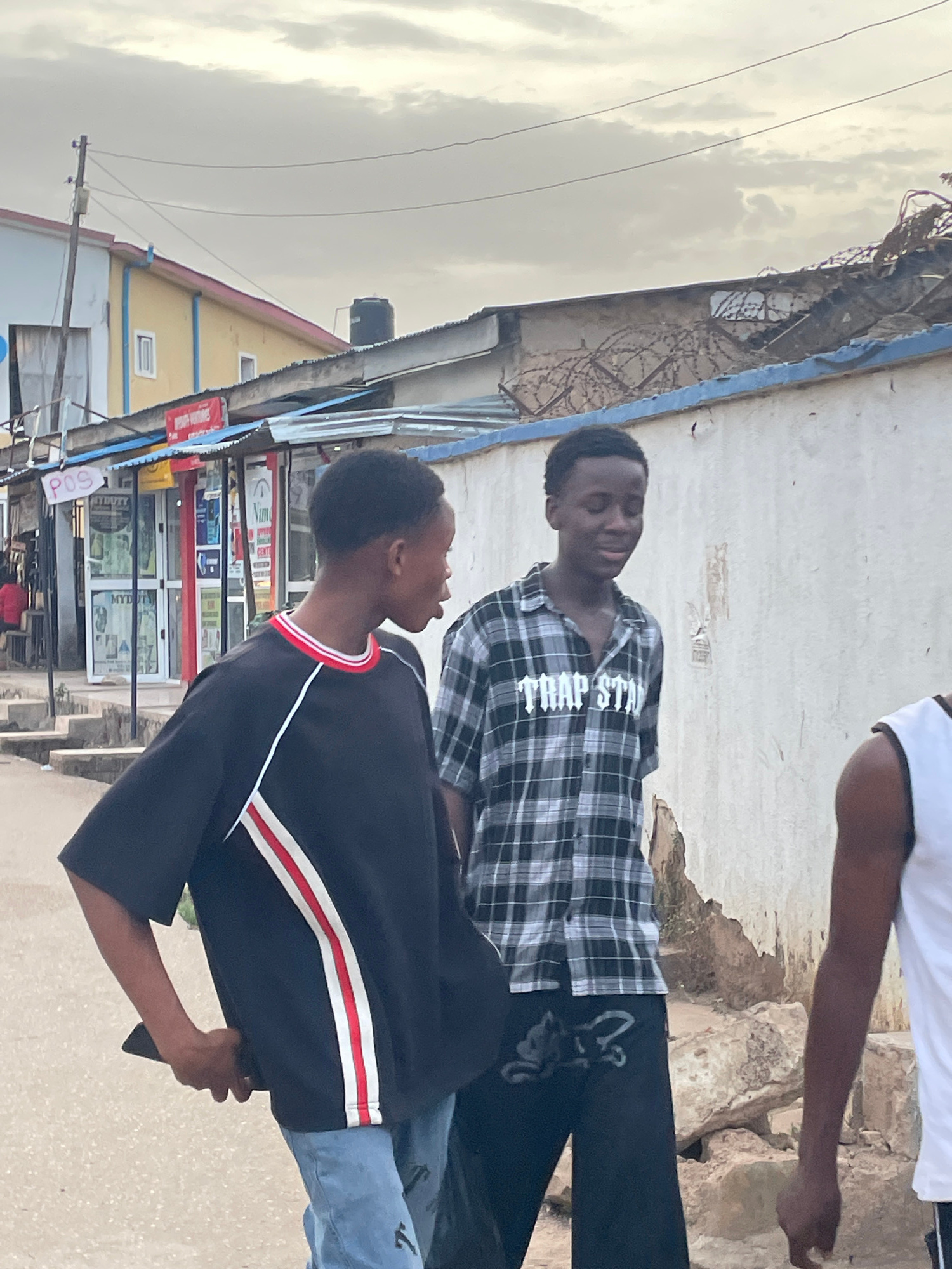 Two young men are standing on a sidewalk in Jos, Nigeria. One is wearing a black shirt with red and white stripes and blue jeans, and holding a phone in his hand. The other is wearing a black and whit…read more