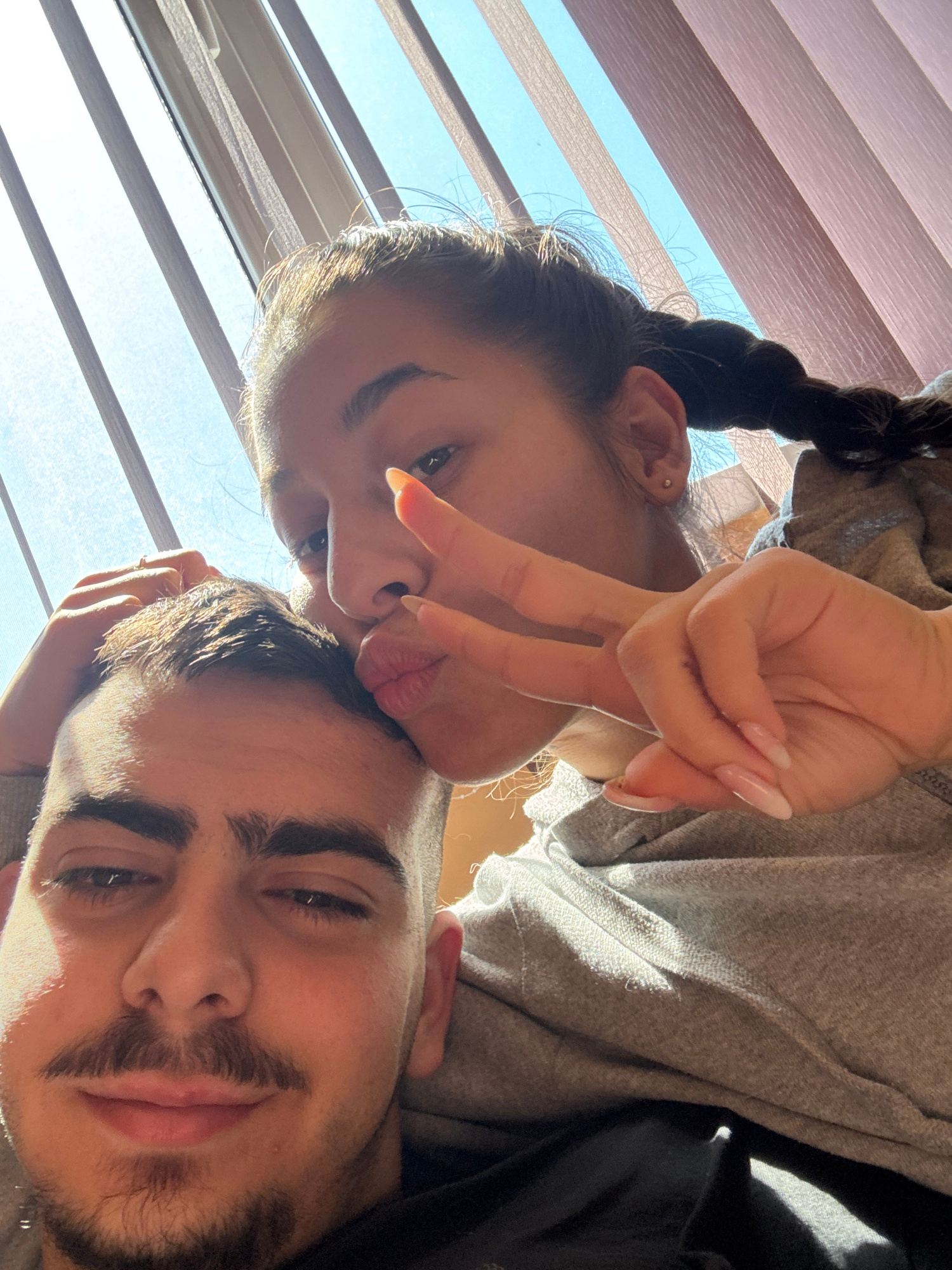 Two people are in the image. A woman with dark hair pulled back in a braid makes a peace sign with her fingers. Her face is tilted to the side as she is laying on top of a man with dark hair, a mustac…read more