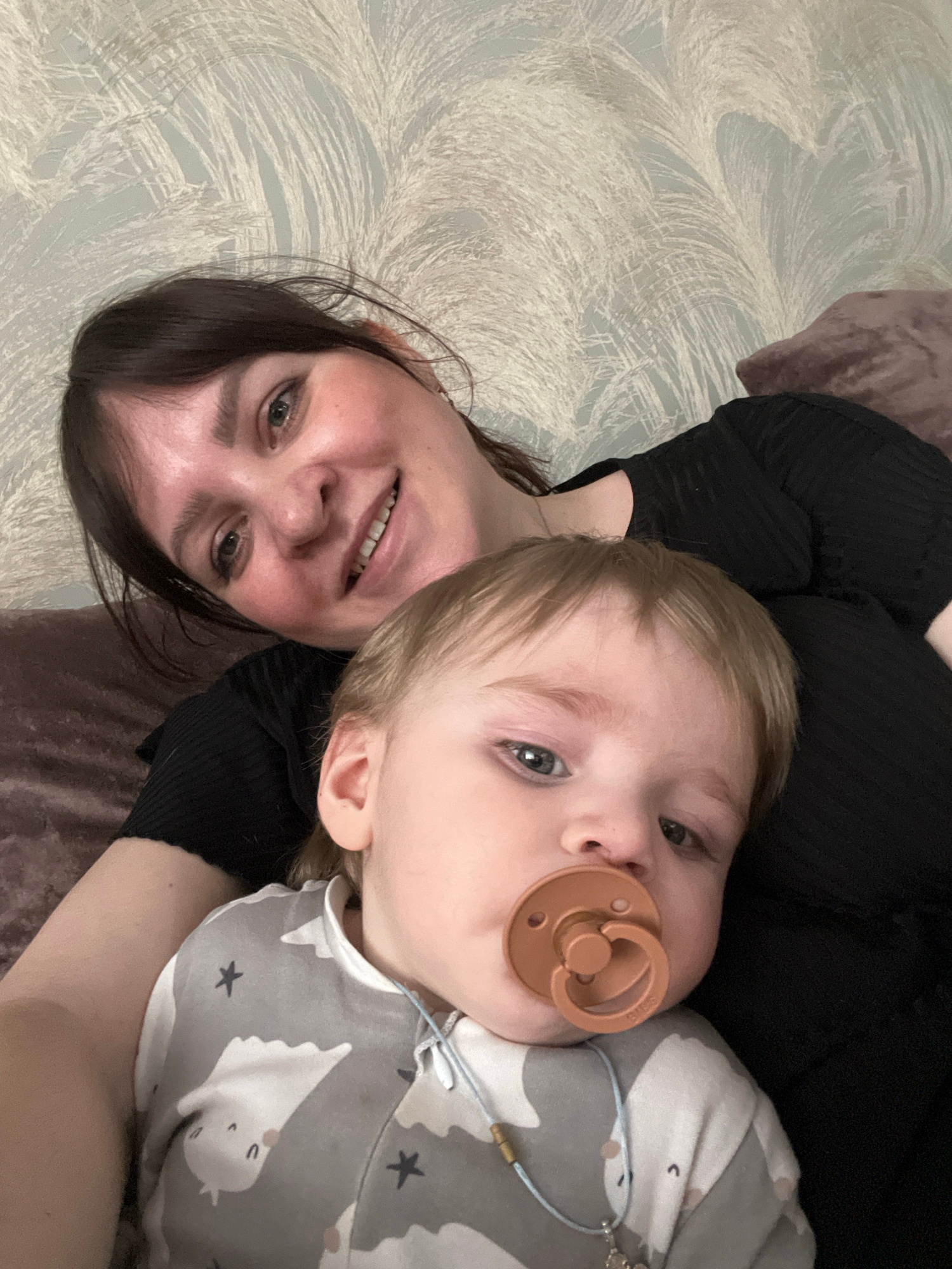 The image depicts an adult female and an infant in an indoor setting, reportedly in Noviy, Russia. The adult female, positioned behind and slightly to the left of the infant, has dark brown hair and i…read more