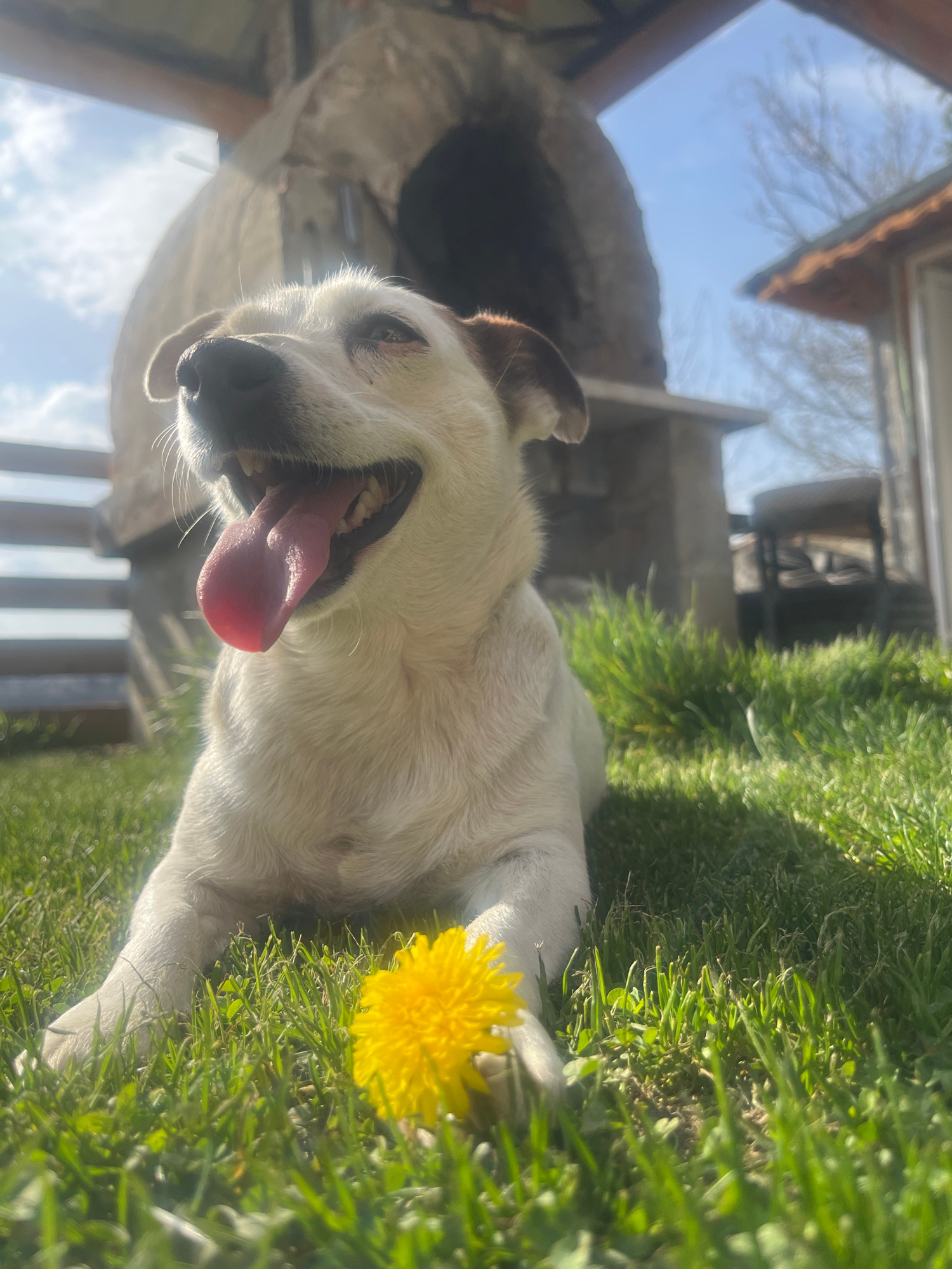 The image depicts a white dog lying on green grass next to a yellow dandelion. The dog's tongue is hanging out. In the background, there's an outdoor structure, likely a pizza oven, and parts of a woo…read more